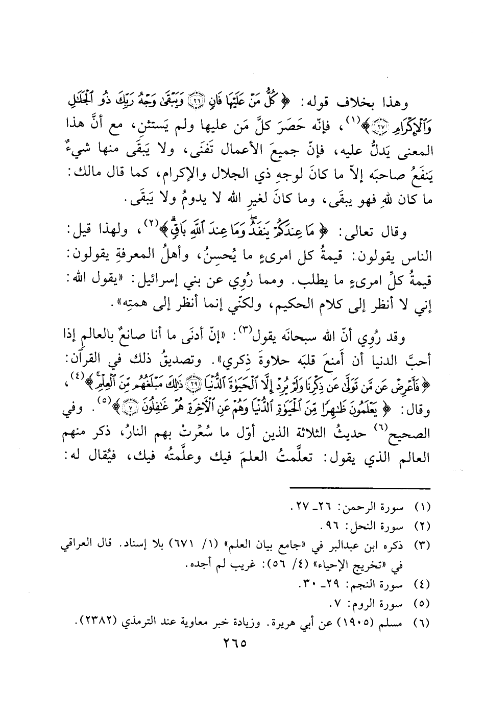 وهذا بخلاف قوله: (كُلُّ مَنْ عَلَيْهَا فَانٍ (26) وَيَبْقَى وَجْهُ رَبِّكَ ذُو الْجَلَالِ وَالْإِكْرَامِ (27)) (1)، فإنّه حَصرَ كلَّ مَن عليها ولم يَستثنِ، مع أنَّ هذا المعنى يَدلُّ عليه، فإنّ جميعَ الأعمال تَفنَى، ولا يَبقَى منها شيء يَنفَعُ صاحبَه إلاّ ما كانَ لوجهِ ذي الجلال والإكرام، كما قال مالك: ما كان لله فهو يبقَى، وما كانَ لغيرِ الله لا يدومُ ولا يَبقَى.