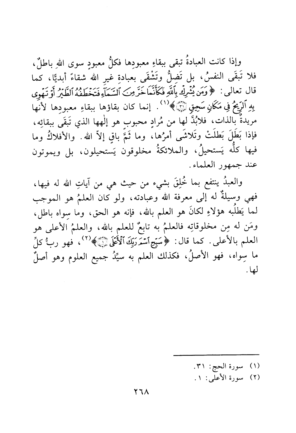 وإذا كانت العبادةُ تبقى ببقاءِ معبودِها فكلُّ معبودٍ سوى الله باطل، فلا تَبقَى النفسُ، بل تَضلُّ وتَشْقَى بعبادةِ غيرِ الله شقاءً أبديا، كما قال تعالى: (وَمَنْ يُشْرِكْ بِاللَّهِ فَكَأَنَّمَا خَرَّ مِنَ السَّمَاءِ فَتَخْطَفُهُ الطَّيْرُ أَوْ تَهْوِي بِهِ الرِّيحُ فِي مَكَانٍ سَحِيقٍ) (1). إنما كان بقاؤها ببقاءِ معبودِها لأنها مريدةٌ بالذات، فلابُدَّ لها من مُرادٍ محبوبٍ هو إلهها الذي تَبقَى ببقائِه، فإذا بَطَلَ بَطلَتْ وتَلاشَى أمرُها، وما ثَمَّ باقٍ إلاّ الله. والأفلاكُ وما فيها كلُّه يَستحيلُ، والملائكةُ مخلوقون يَستحيلون، بل ويموتون عند جمهور العلماء.