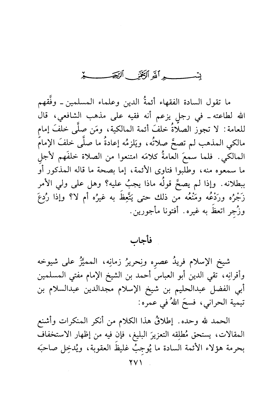 شيخ الإسلام فريدُ عصرِه ونحريرُ زمانِه، المميَّزُ على شيوخه وأقرانِه، تقي الدين أبو العباس أحمد بن الشيخ الإمام مفتي المسلمين أبي الفضل عبد الحليم بن شيخ الإسلام مجدالدين عبد السلام بن تيمية الحراني، فسحَ الله في عمره: الحمد لله وحده. إطلاقُ هذا الكلام من أنكر المنكرات وأشنع المقالات، يستحق مُطلِقه التعزيرَ البليغ، فإن فيه من إظهار الاستخفاف بحرمة هؤلاء الأئمة السادة ما يُوجِبُ غليظَ العقوبة، ويُدخِل صاحبَه
