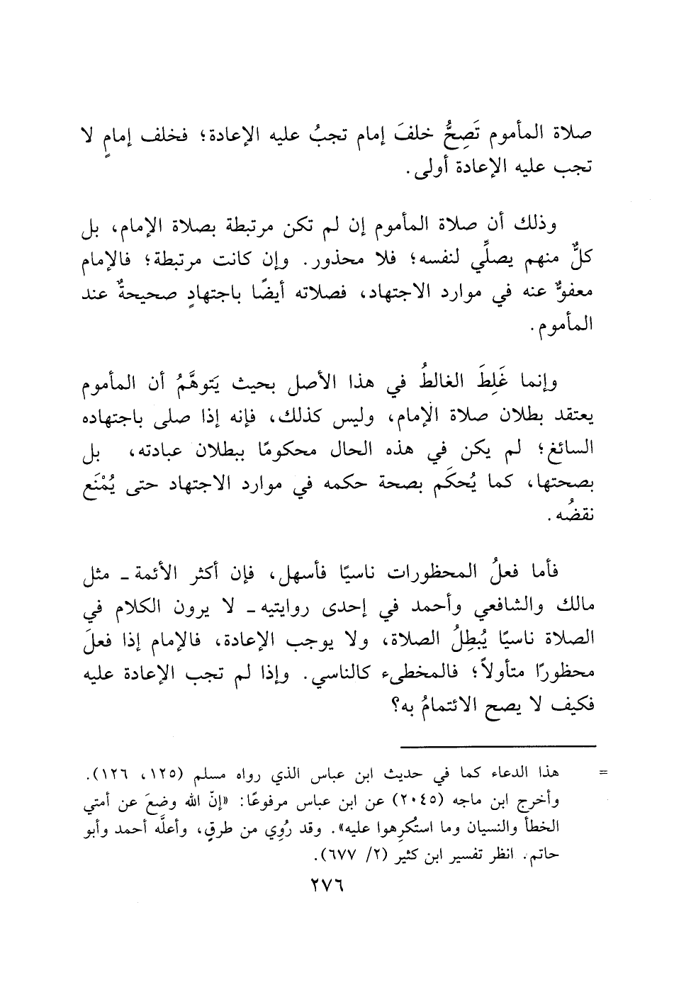 وإنما غَلِطَ الغالطُ في هذا الأصل بحيث يَتوهَّمُ أن المأموم يعتقد بطلان صلاة الإمام، وليس كذلك، فإنه إذا صلى باجتهاده السائغ؛ لم يكن في هذه الحال محكومًا ببطلان عبادته، بل بصحتها، كما يُحكَم بصحة حكمه في موارد الاجتهاد حتى يُمْنَع نقضُه.