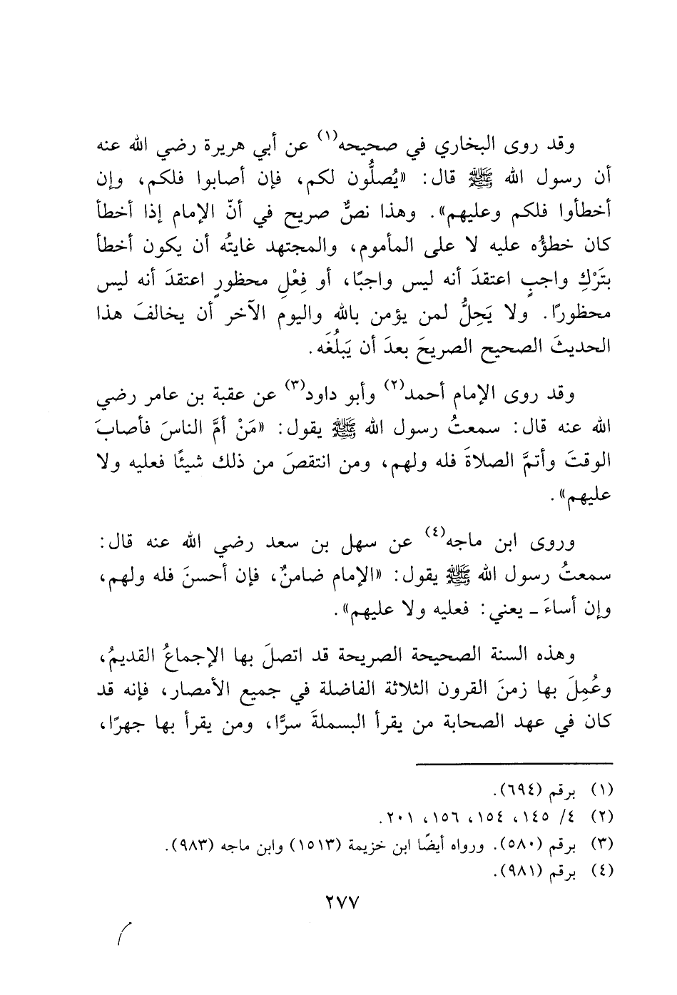 وقد روى البخاري في صحيحه (1) عن أبي هريرة رضي الله عنه أن رسول الله - صَلَّى اللَّهُ عَلَيْهِ وَسَلَّمَ - قال: "يُصلُّون لكم، فإن أصابوا فلكم، وإن أخطأوا فلكم وعليهم". وهذا نص صريح في أنّ الإمام إذا أخطأ كان خطؤُه عليه لا على المأموم، والمجتهد غايتُه أن يكون أخطأ بتَرْكِ واجب اعتقدَ أنه ليس واجبًا، أو فِعْلِ محظورٍ اعتقدَ أنه ليس محظورًا. ولا يَحِلُّ لمن يؤمن بالله واليوم الآخر أن يخالفَ هذا الحديثَ الصحيح الصريحَ بعدَ أن يَبلُغَه.