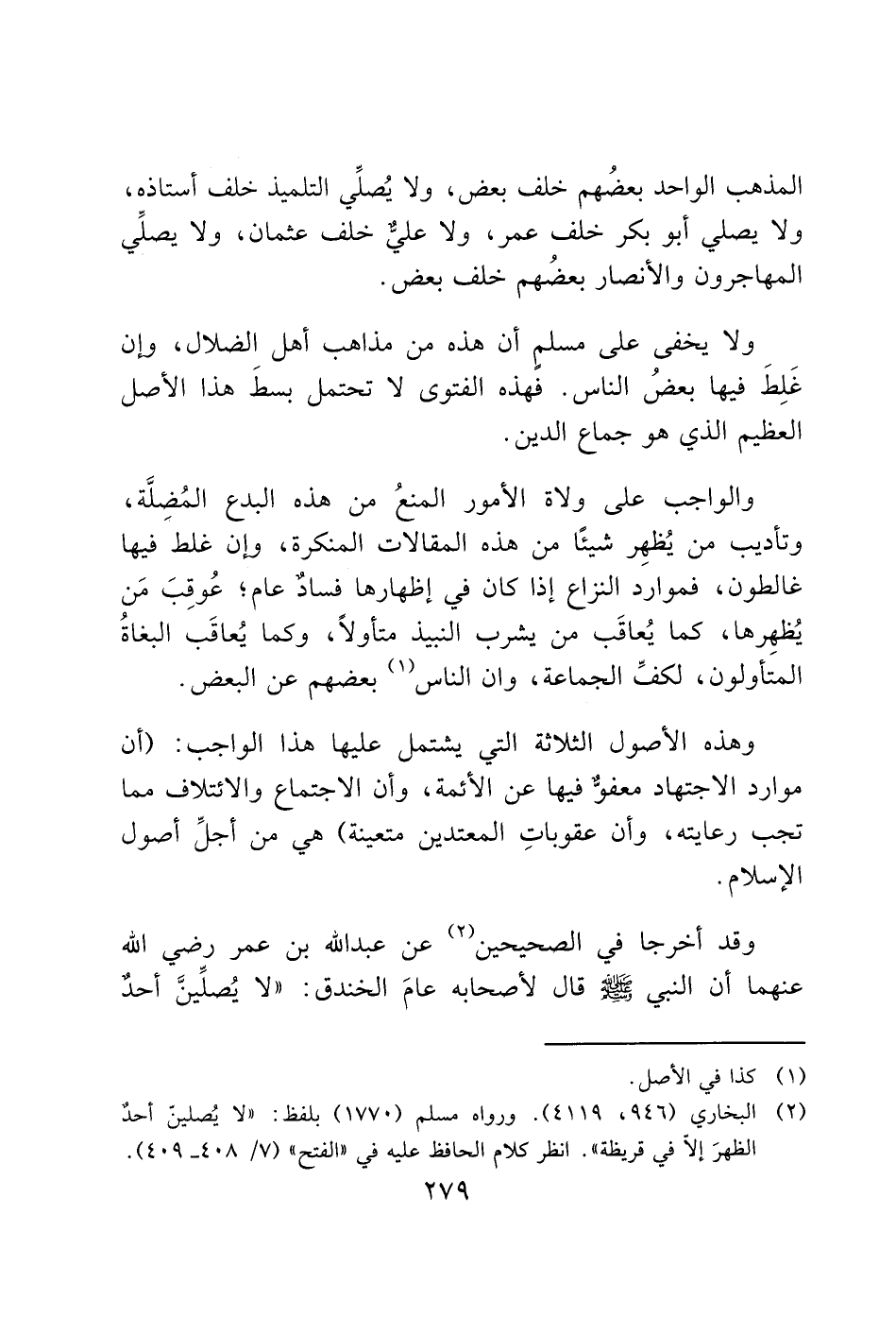 وهذه الأصول الثلاثة التي يشتمل عليها هذا الواجب: (أن موارد الاجتهاد معفوّ فيها عن الأئمة، وأن الاجتماع والائتلاف مما تجب رعايته، وأن عقوباتِ المعتدين متعينة) هي من أجلِّ أصول الإسلام.