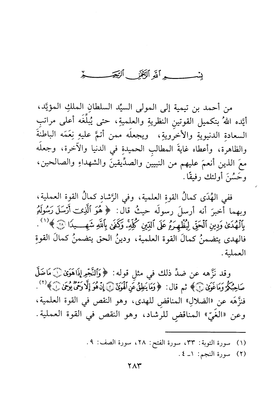 من أحمد بن تيمية إلى المولى السيِّد السلطانِ الملكِ المؤيَّد، أيده الله بتكميل القوتينِ النظريةِ والعلميةِ، حتى يُبلِّغَه أعلى مراتب السعادةِ الدنيويةِ والأخرويةِ، ويجعلَه ممن أتمَّ عليهِ نِعَمَه الباطنَةَ والظاهرة، وأعطاه غايةَ المطالب الحميدةِ في الدنيا والآخرة، وجعلَه معَ الذين أنعمَ عليهم من النبيين والصدِّيقينَ والشهداءِ والصالحين، وحَسُنَ أولئك رفيقًا.