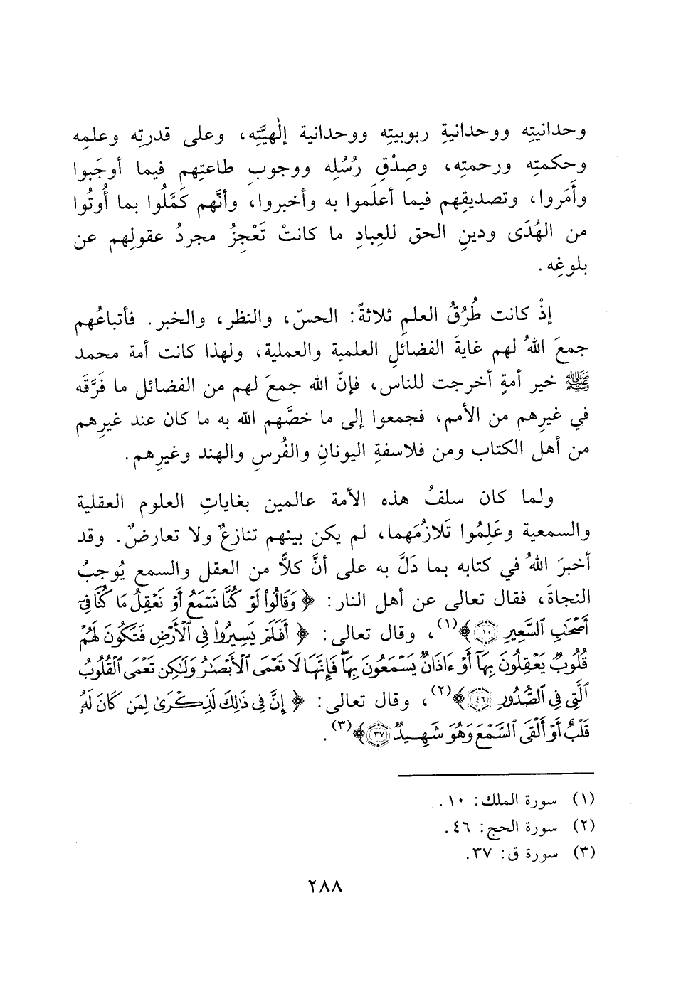 ولما كان سلفُ هذه الأمة عالمين بغاياتِ العلوم العقلية والسمعية وعَلِمُوا تَلازُمَهما، لم يكن بينهم تنازع ولا تعارض. وقد أخبرَ الله في كتابه بما دَلَّ به على أنَّ كلاًّ من العقل والسمع يُوجبُ النجاةَ، فقال تعالى عن أهل النار: (وَقَالُوا لَوْ كُنَّا نَسْمَعُ أَوْ نَعْقِلُ مَا كُنَّا فِي أَصْحَابِ السَّعِيرِ (10)) (1)، وقال تعالى: (أَفَلَمْ يَسِيرُوا فِي الْأَرْضِ فَتَكُونَ لَهُمْ قُلُوبٌ يَعْقِلُونَ بِهَا أَوْ آَذَانٌ يَسْمَعُونَ بِهَا فَإِنَّهَا لَا تَعْمَى الْأَبْصَارُ وَلَكِنْ تَعْمَى الْقُلُوبُ الَّتِي فِي الصُّدُورِ (46)) (2)، وقال تعالى: (إِنَّ فِي ذَلِكَ لَذِكْرَى لِمَنْ كَانَ لَهُ قَلْبٌ أَوْ أَلْقَى السَّمْعَ وَهُوَ شَهِيدٌ (37)) (3).