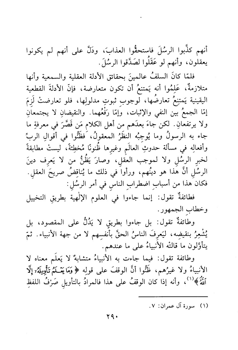 فلمّا كانَ السلفُ عالمينَ بحقائق الأدلة العقلية والسمعية وأنها متلازمة، عَلِمُوا أنه يَمتنعُ أن تكون متعارضة، فإنّ الأدلةَ القطعية اليقينية يَمتنِعُ تعارضُها، لوجوب ثبوتِ مدلولها، فلو تعارضتْ لَزِمَ إمّا الجمعُ بين النفي والإثبات، وَإمّا رَفْعُهما. والنقيضانِ لا يجتمعانِ ولا يرتفعانِ. لكن جاءَ بعدَهم من أهل الكلام مَن قَصَّرَ في معرفةِ ما جاء به الرسولُ وما يُوجبُه النظَرُ المعقولُ، َ فظَنُّوا في أقوالِ الربِّ وأفعالِه في مسألة حدوثَ العالَمِ وغيرِها ظُنونًا مُخطِئةً، ليستْ مطابقةً لخبرِ الرسُلِ ولا لموجب العقلِ، وصارَ يَظُنُّ من لا يَعرِف دينَ الرسُلِ أن هذا هو دينُهم، ورأوا في ذلك ما يُناقِضُ صريحَ العقلِ.