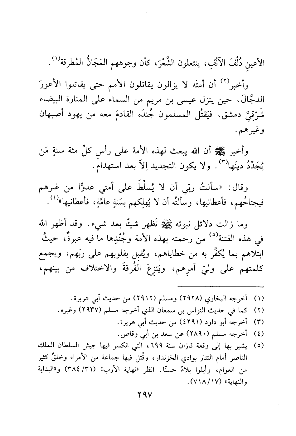 وأخبر (2) أن أمتَه لا يزالون يقاتلون الأمم حتى يقاتلوا الأعورَ الدجَّالَ، حين ينزل عيسى بن مريم من السماء على المنارة البيضاء شَرْقِيَّ دمشق، فيَقتُل المسلمون جُندَه القادمَ معه من يهود أصبهان وغيرهم.