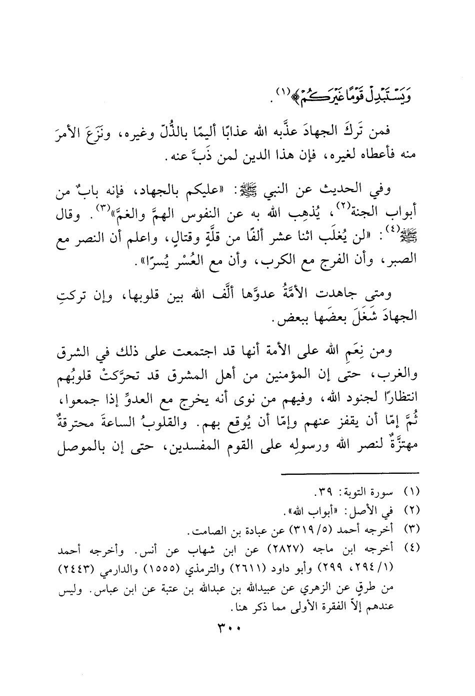 فمن تَركَ الجهادَ عذَّبه الله عذابًا أليمًا بالذُّلّ وغيره، ونَزَعَ الأمرَ منه فأعطاه لغيره، فإن هذا الدين لمن ذَبَّ عنه.