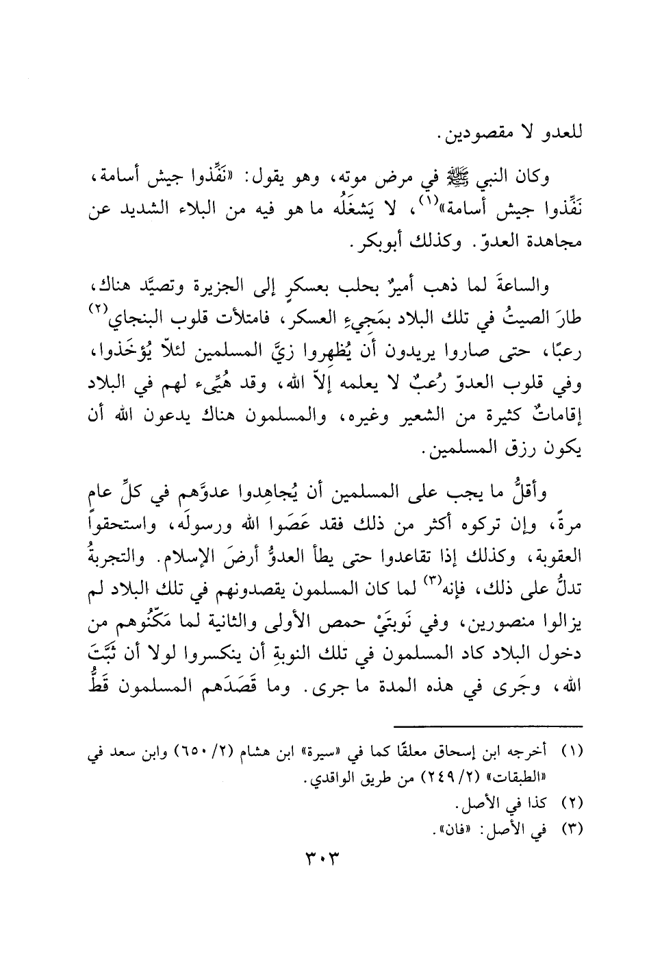 وأقلُّ ما يجب على المسلمين أن يُجاهِدوا عدوَّهم في كلِّ عام مرةً، وإن تركوه أكثر من ذلك فقد عَصوا الله ورسولَه، واستحقوا العقوبة، وكذلك إذا تقاعدوا حتى يطأ العدوُّ أرضَ الإسلام. والتجربةُ تدلُّ على ذلك، فإنه (3) لما كان المسلمون يقصدونهم في تلك البلاد لم يزالوا منصورين، وفي نَوبتَيْ حمص الأولى والثانية لما مَكّنُوهم من دخول البلاد كاد المسلمون في تلك النوبةِ أن ينكسروا لولا أن ثبَّتَ الله، وجَرى في هذه المدة ما جرى. وما قَصَدَهم المسلمون قَطُّ