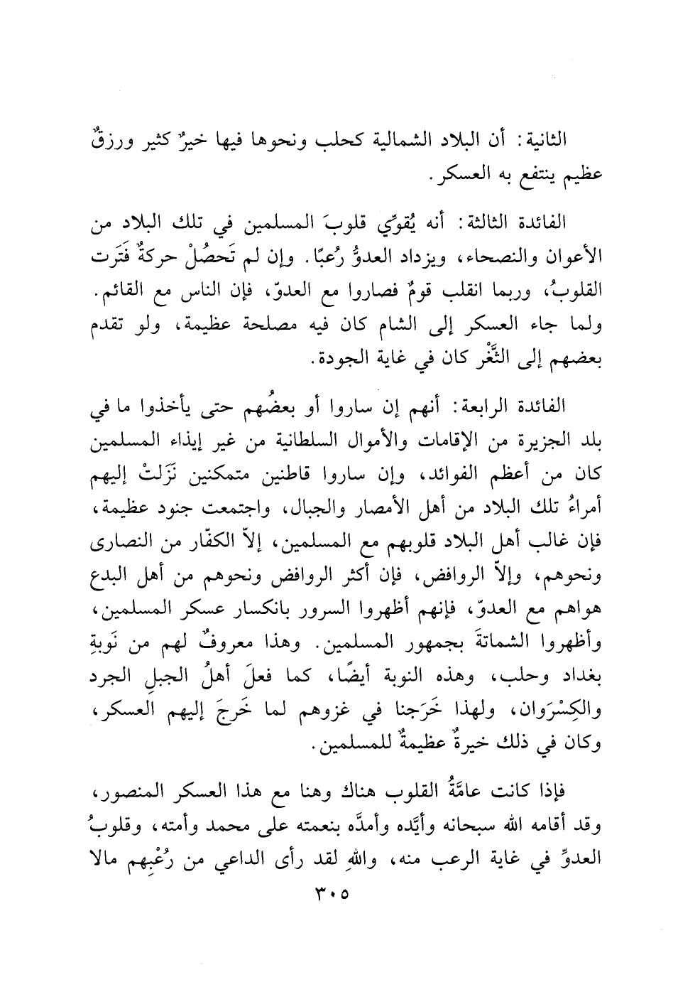 الثانية: أن البلاد الشمالية كحلب ونحوها فيها خير كثير ورزق عظيم ينتفع به العسكر.