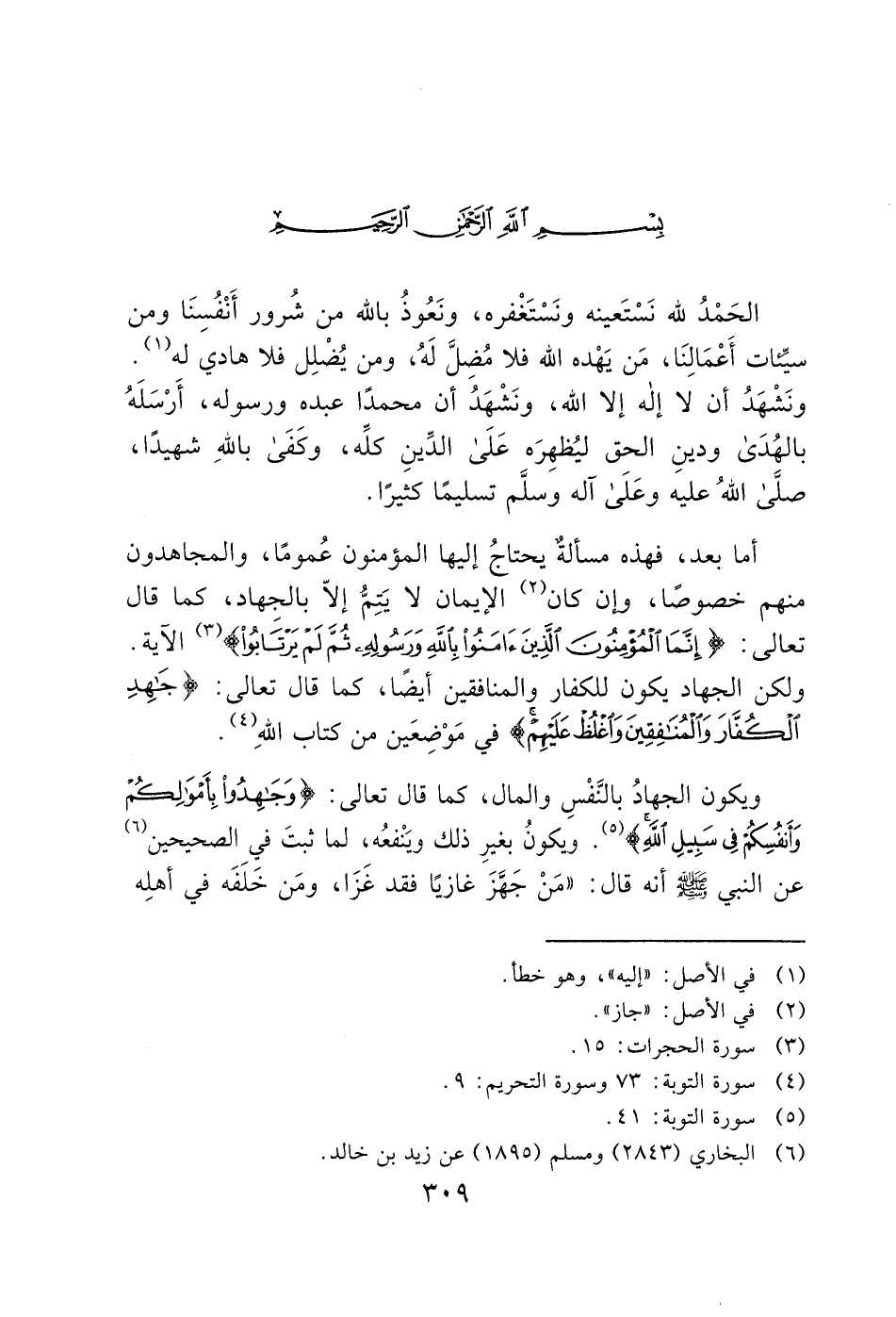 أما بعد، فهذه مسألة يحتاجُ إليها المؤمنون عُمومًا، والمجاهدون منهم خصوصًا، وإن كان (2) الإيمان لا يَتِمُّ إلاّ بالجِهاد، كما قال تعالى: (إِنَّمَا الْمُؤْمِنُونَ الَّذِينَ آَمَنُوا بِاللَّهِ وَرَسُولِهِ ثُمَّ لَمْ يَرْتَابُوا) (3) الآية.
