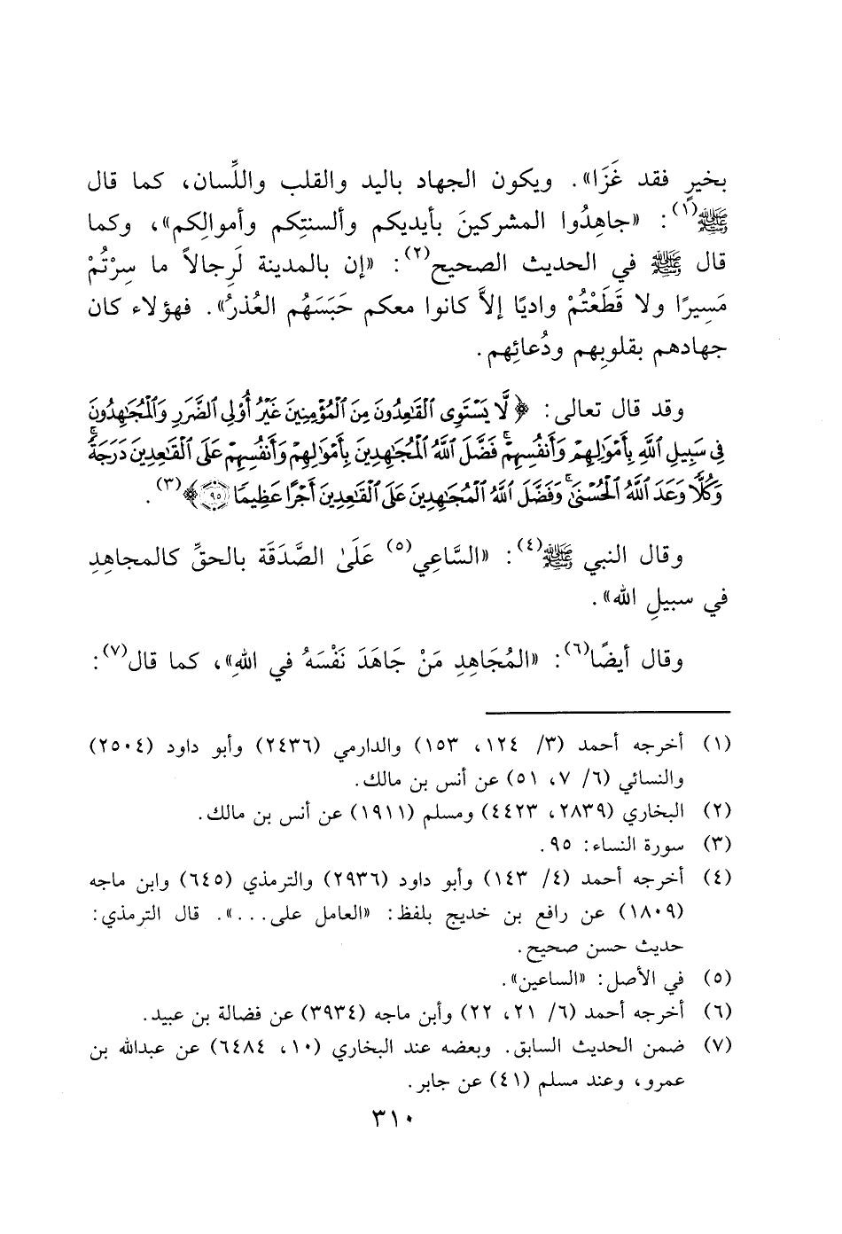 وقد قال تعالى: (لَا يَسْتَوِي الْقَاعِدُونَ مِنَ الْمُؤْمِنِينَ غَيْرُ أُولِي الضَّرَرِ وَالْمُجَاهِدُونَ فِي سَبِيلِ اللَّهِ بِأَمْوَالِهِمْ وَأَنْفُسِهِمْ فَضَّلَ اللَّهُ الْمُجَاهِدِينَ بِأَمْوَالِهِمْ وَأَنْفُسِهِمْ عَلَى الْقَاعِدِينَ دَرَجَةً وَكُلًّا وَعَدَ اللَّهُ الْحُسْنَى وَفَضَّلَ اللَّهُ الْمُجَاهِدِينَ عَلَى الْقَاعِدِينَ أَجْرًا عَظِيمًا (95)) (3).