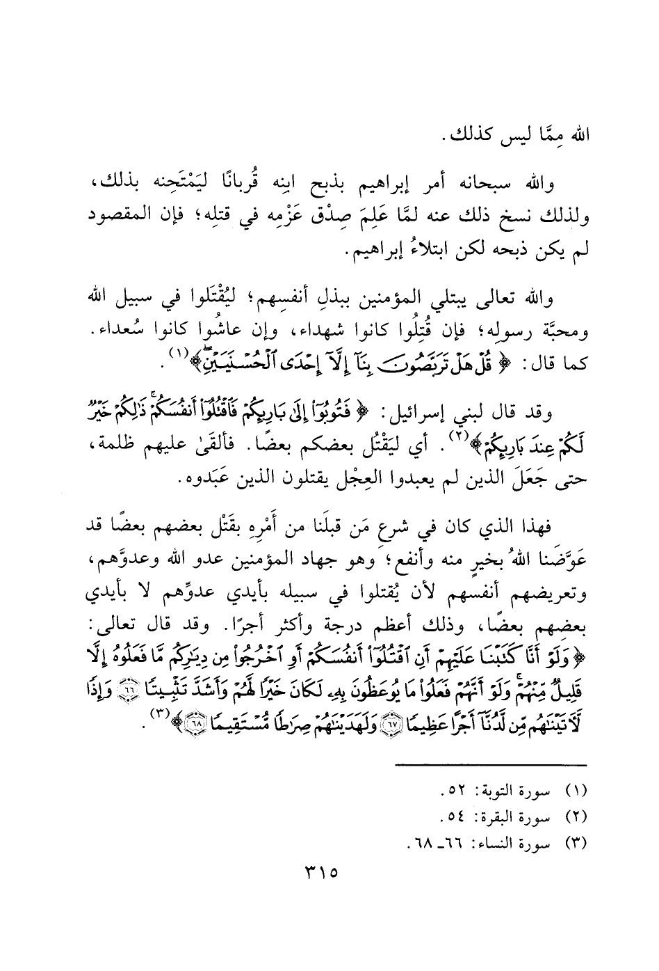 فهذا الذي كان في شرعِ مَن قبلَنا من أَمْرِهِ بقَتْل بعضهم بعضًا قد عَوَّضَنا الله بخيرٍ منه وأنفع؛ وهو جهاد المؤمنين عدو الله وعدوَّهم، وتعريضهم أنفسهم لأن يُقتلوا في سبيله بأيدي عدوِّهم لا بأيدي بعضهم بعضًا، وذلك أعظم درجة وأكثر أجرًا. وقد قال تعالى: (وَلَوْ أَنَّا كَتَبْنَا عَلَيْهِمْ أَنِ اقْتُلُوا أَنْفُسَكُمْ أَوِ اخْرُجُوا مِنْ دِيَارِكُمْ مَا فَعَلُوهُ إِلَّا قَلِيلٌ مِنْهُمْ وَلَوْ أَنَّهُمْ فَعَلُوا مَا يُوعَظُونَ بِهِ لَكَانَ خَيْرًا لَهُمْ وَأَشَدَّ تَثْبِيتًا (66) وَإِذًا لَآَتَيْنَاهُمْ مِنْ لَدُنَّا أَجْرًا عَظِيمًا (67) وَلَهَدَيْنَاهُمْ صِرَاطًا مُسْتَقِيمًا (68)) (3).