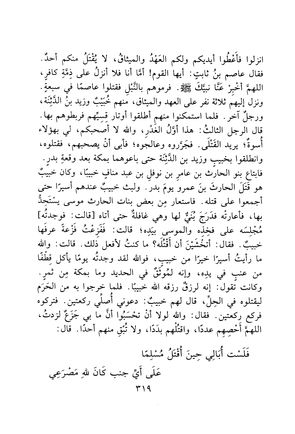 انزلوا فأَعْطُوا أيديكم ولكم العَهْدُ والميثاقُ، لا يُقْتَلُ منكم أحدٌ. فقال عاصم بنُ ثابتٍ: أيها القوم! أمَّا أنا فلا أنزلُ على ذِمَّةِ كافرٍ، اللهمَّ أخْبرْ عَنَّا نبيَّكَ - صَلَّى اللَّهُ عَلَيْهِ وَسَلَّمَ -. فرموهم بالنَّبْلِ فقتلوا عاصمًا في سبعةٍ.