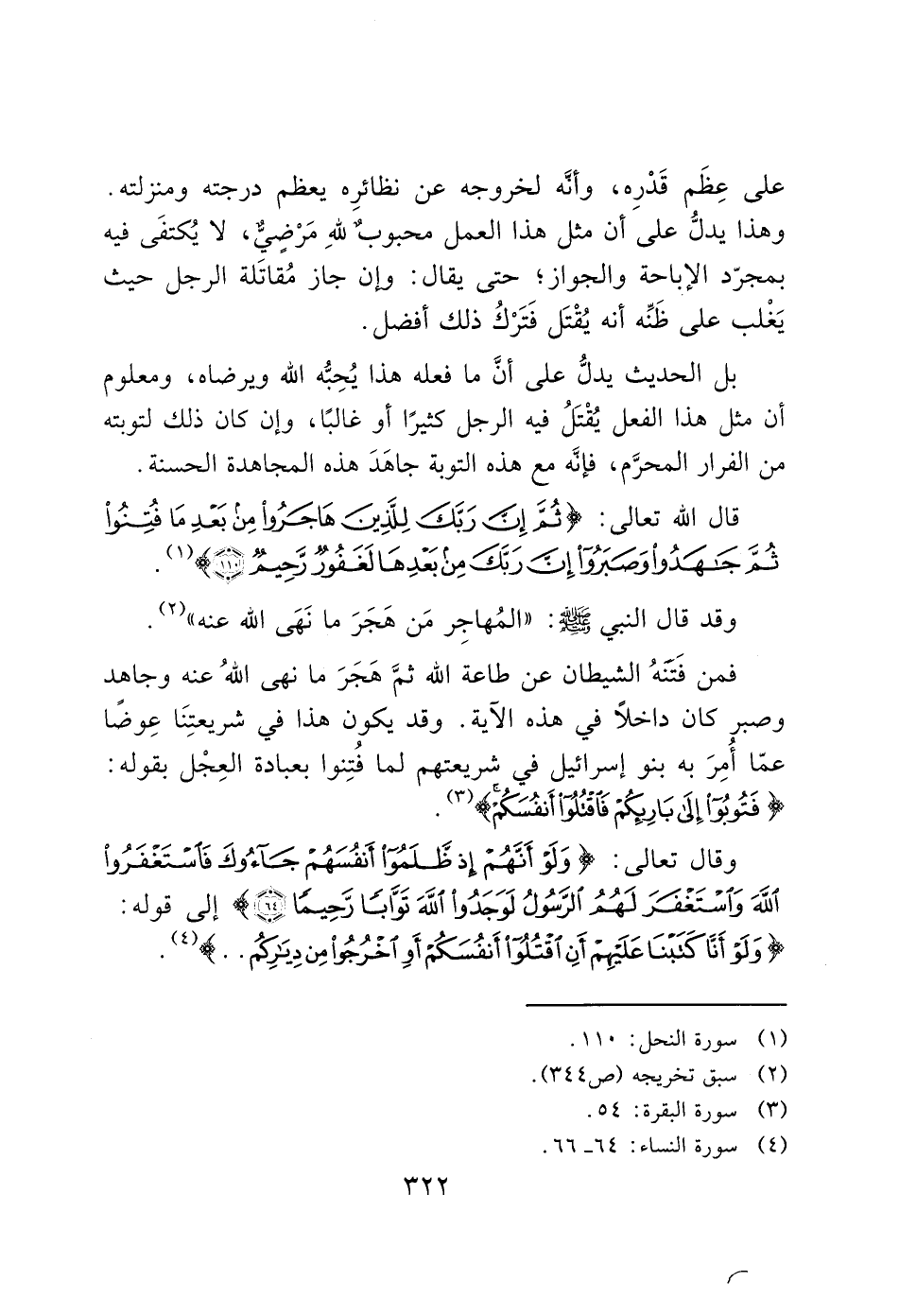 وقال تعالى: (وَلَوْ أَنَّهُمْ إِذْ ظَلَمُوا أَنْفُسَهُمْ جَاءُوكَ فَاسْتَغْفَرُوا اللَّهَ وَاسْتَغْفَرَ لَهُمُ الرَّسُولُ لَوَجَدُوا اللَّهَ تَوَّابًا رَحِيمًا (64)) إلى قوله: (وَلَوْ أَنَّا كَتَبْنَا عَلَيْهِمْ أَنِ اقْتُلُوا أَنْفُسَكُمْ أَوِ اخْرُجُوا مِنْ دِيَارِكُمْ ..) (4).