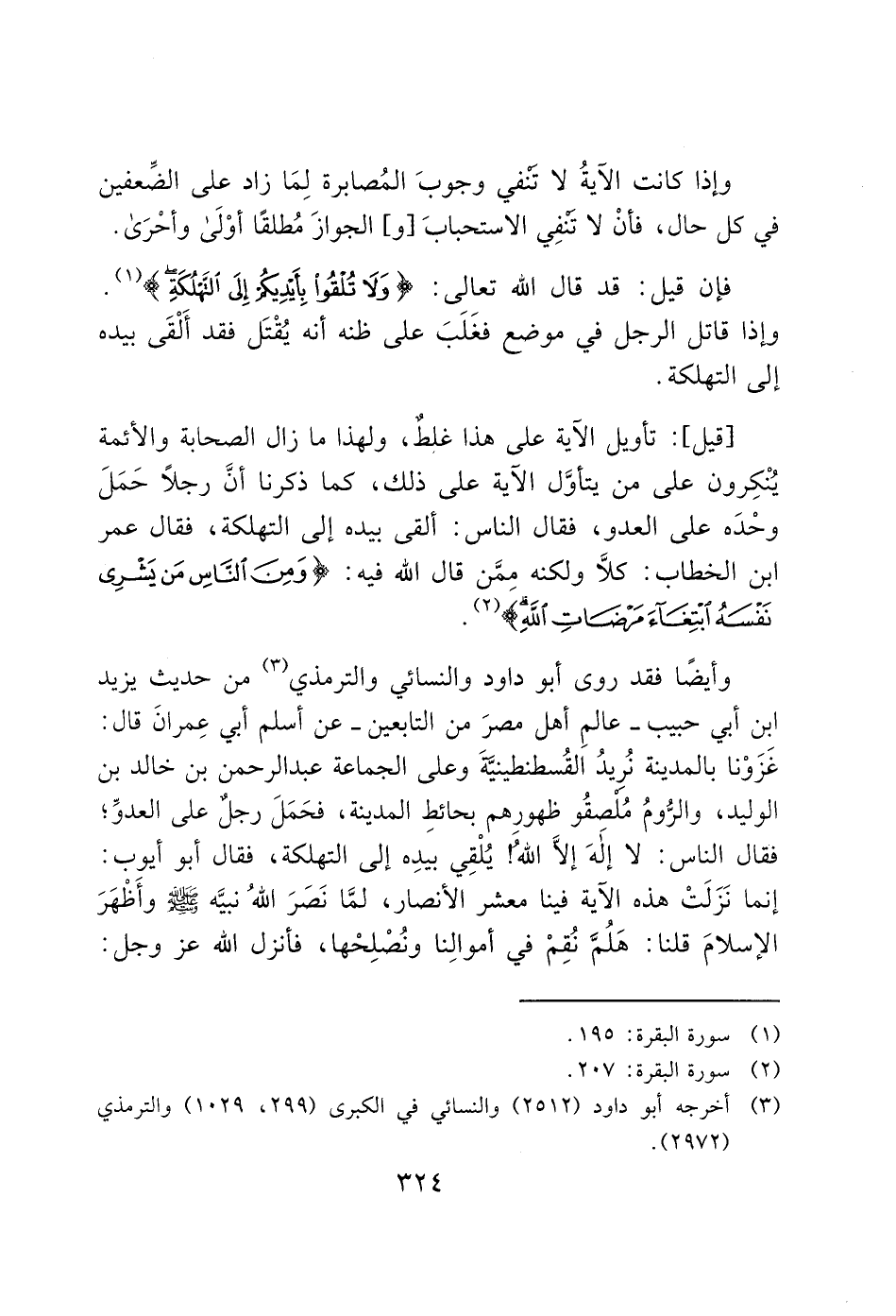 وأيضًا فقد روى أبو داود والنسائي والترمذي (3) من حديث يزيد ابِن أبي حبيب -عالمِ أهل مصرَ من التابعين- عن أسلم أبي عِمرانَ قال: غزَوْنا بالمدينة نُريدُ القُسطنطينيَّةَ وعلى الجماعة عبد الرحمن بن خالد بن الوليد، والرُّومُ مُلصقُو ظهورهم بحائطِ المدينة، فحَمَلَ رجلٌ على العدوِّ؛ فقال الناس: لا إلهَ إلا الله! يُلْقِي بيدِه إلى التهلكة، فقال أبو أيوب: إنما نَزَلَتْ هذه الآية فينا معشر الأنصار، لمَّا نَصَرَ الله نبيَّه - صَلَّى اللَّهُ عَلَيْهِ وَسَلَّمَ - وأَظْهَرَ الإسلامَ قلنا: هَلُمَّ نُقِمْ في أموالِنا ونُصلِحْها، فأنزل الله عز وجل: