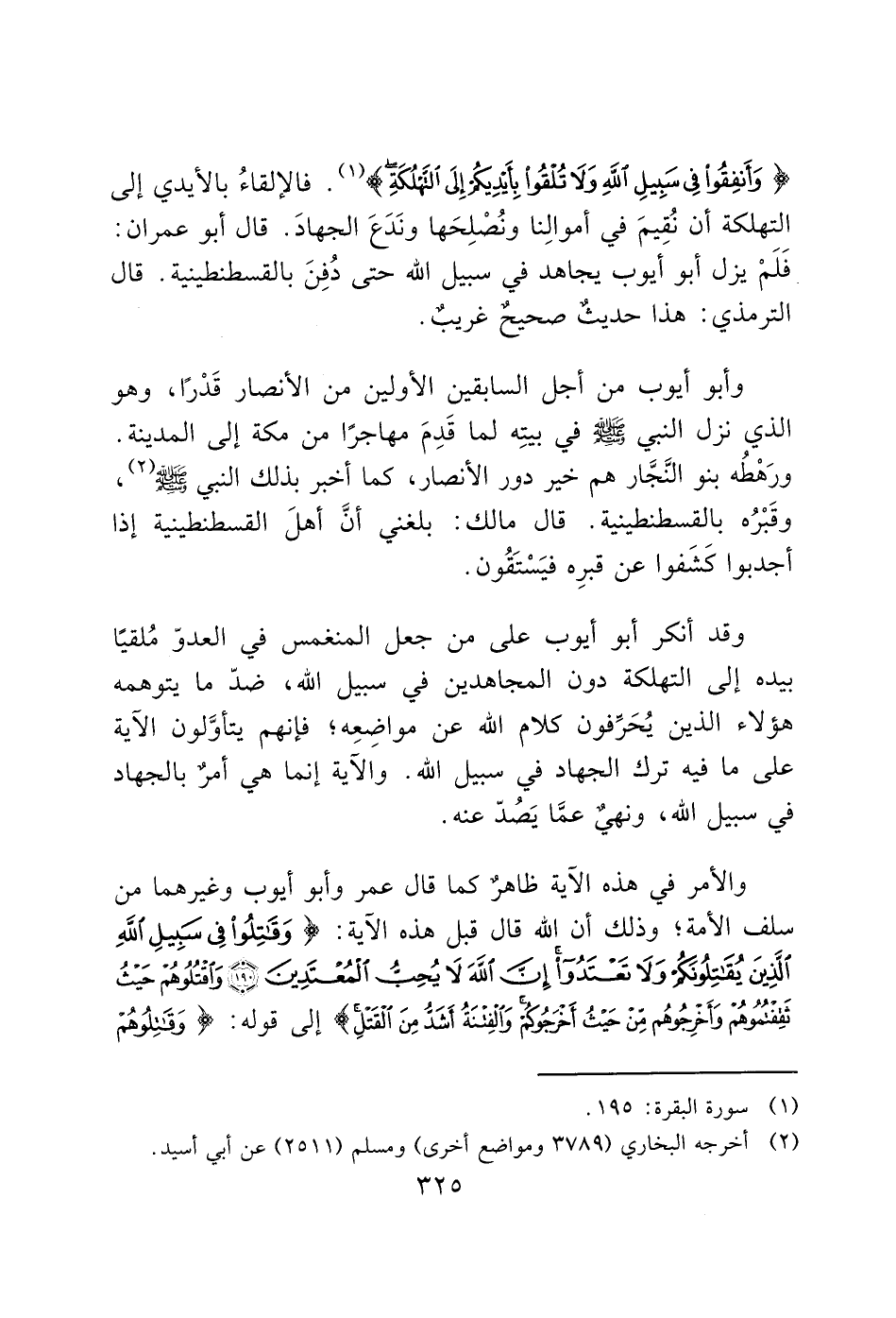 (وَأَنْفِقُوا فِي سَبِيلِ اللَّهِ وَلَا تُلْقُوا بِأَيْدِيكُمْ إِلَى التَّهْلُكَةِ) (1). فالإلقاءُ بالأيدي إلى التهلكة أن نُقِيمَ في أموالِنا ونُصْلِحَها ونَدَعَ الجهادَ. قال أبو عمران: فَلَمْ يزل أبو أيوب يجاهد في سبيل الله حتى دُفِنَ بالقسطنطينية. قال الترمذي: هذا حديث صحيح غريب.