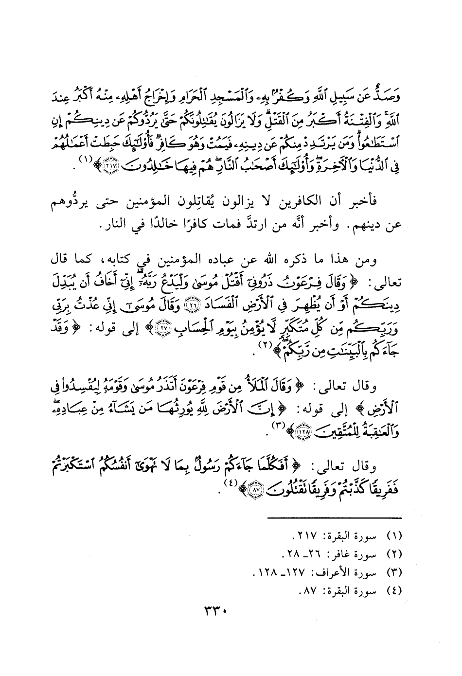 وَصَدٌّ عَنْ سَبِيلِ اللَّهِ وَكُفْرٌ بِهِ وَالْمَسْجِدِ الْحَرَامِ وَإِخْرَاجُ أَهْلِهِ مِنْهُ أَكْبَرُ عِنْدَ اللَّهِ وَالْفِتْنَةُ أَكْبَرُ مِنَ الْقَتْلِ وَلَا يَزَالُونَ يُقَاتِلُونَكُمْ حَتَّى يَرُدُّوكُمْ عَنْ دِينِكُمْ إِنِ اسْتَطَاعُوا وَمَنْ يَرْتَدِدْ مِنْكُمْ عَنْ دِينِهِ فَيَمُتْ وَهُوَ كَافِرٌ فَأُولَئِكَ حَبِطَتْ أَعْمَالُهُمْ فِي الدُّنْيَا وَالْآَخِرَةِ وَأُولَئِكَ أَصْحَابُ النَّارِ هُمْ فِيهَا خَالِدُونَ (217)) (1).
