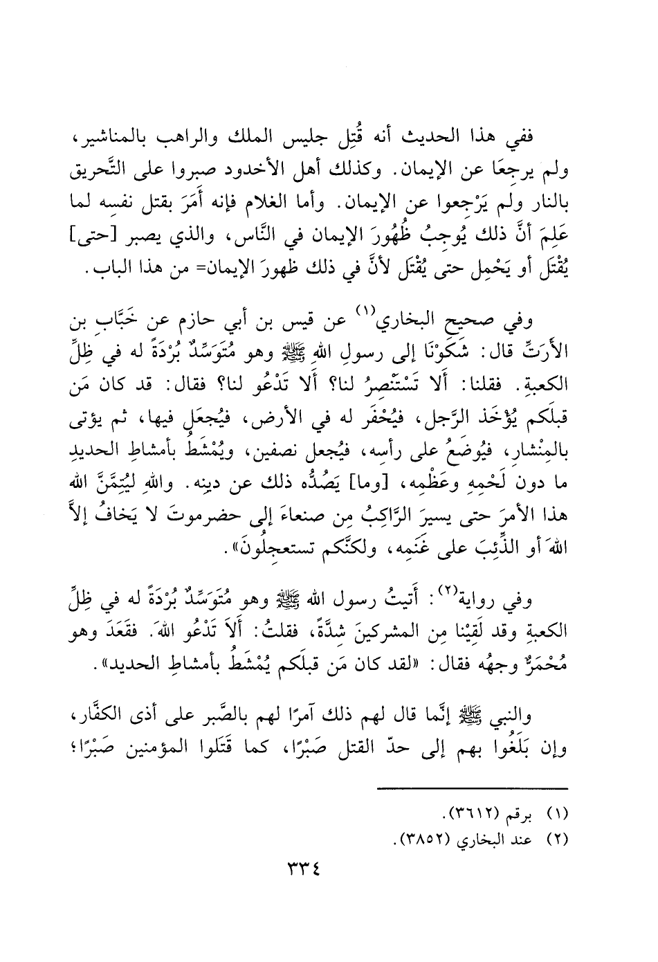 وفي صحيحِ البخاري (1) عن قيس بن أبي حازم عن خَبَّاب بن الأرَتِّ قال: شَكوْنَا إلى رسولِ الله - صَلَّى اللَّهُ عَلَيْهِ وَسَلَّمَ - وهو مُتَوَسِّدٌ بُرْدَةً له فيَ ظِلِّ الكعبةِ. فقلنا: أَلا تَسْتنصِرُ لنا؟ أَلا تَدْعُو لنا؟ فقال: قد كان مَن قبلَكم يُؤخَذ الِرَّجل، فيُحْفَر له في الأرض، فيُجعَل فيها، ثم يؤتى بالمِنْشارِ، فيُوضعُ على رأسه، فيُجعل نصفين، ويُمْشَطُ بأمشاطِ الحديدِ ما دون لَحْمِهِ وعَظْمِه، [وما] يَصُدُّه ذلك عن دينه. والله ليُتِمَّنَّ الله هذا الأمرَ حتى يسيرِ الرَّاكِبُ مِن صنعاءَ إلى حضرموتَ لا يَخافُ إلا الله أو الذِّئِبَ على غنَمِه، ولكنَّكم تستعجِلُونَ".