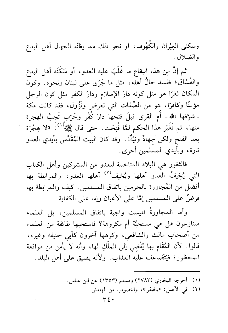 ثم إنَّ مِن هذه البقاع ما غَلَبَ عليه العدو، أو سَكَنَه أهل البدع والفُسَّاق؛ ففسد حالُ أهله، مثل ما جَرَى على لبنان ونحوه. وكون المكان ثغرًا هو مثل كونه دارَ الإسلام ودارَ الكفر مثل كون الرجل مؤمنًا وكافرًا، هو من الصِّفات التي تعرض وتزول، فقد كانت مكة -شرَّفها الله- أُم القرى قبلَ فتحها دارَ كُفْر وحَرْب تَجبُ الهجرة منها، ثم تَغَيّر هذا الحكم لمَّا فتِحَت. حتى قال - صَلَّى اللَّهُ عَلَيْهِ وَسَلَّمَ - (1). "لا هِجْرَة بعد الفتح ولكن جهاد ونيَّة". وقد كان البيت المُقَدَّس بأيدي العدو تارة، وبأيدي المسلمين أخرى.