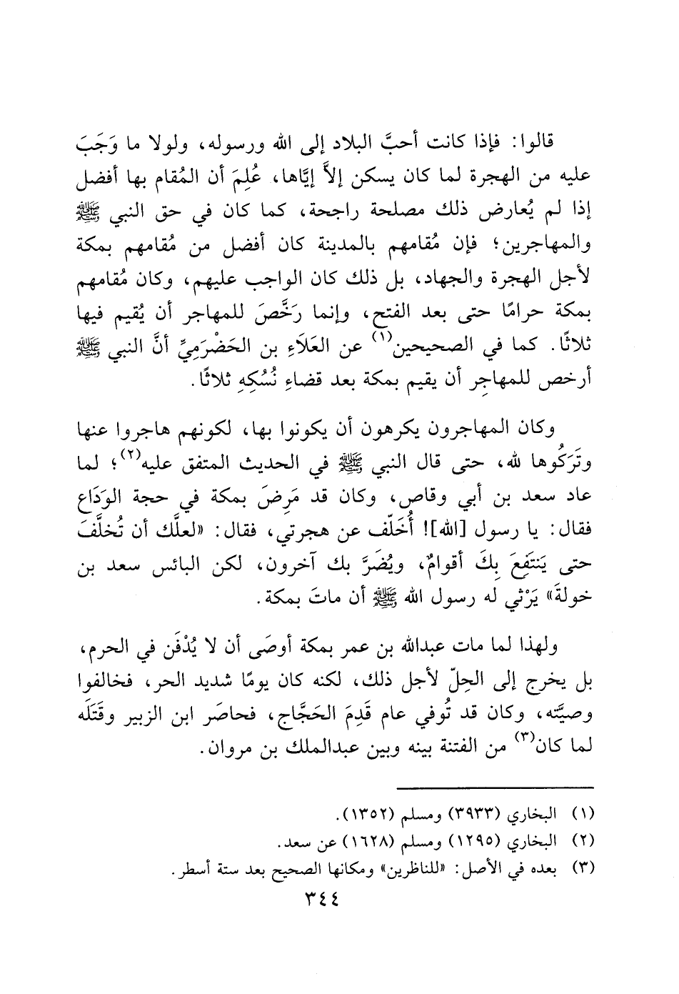 وكان المهاجرون يكرهون أن يكونوا بها، لكونهم هاجروا عنها وتَرَكُوها لله، حتى قال النبي - صَلَّى اللَّهُ عَلَيْهِ وَسَلَّمَ - في الحديث المتفق عليه (2)؛ لما عاد سعد بن أبي وقاص، وكان قد مَرِضَ بمكة في حجة الوَدَاع فقال: يا رسول [الله]! أُخَلّف عن هجرتي، فقال: "لعلَّك أن تُخلَّفَ حتى يَنتَفِعَ بكَ أقوام، ويُضَرَّ بك آخرون، لكن البائس سعد بن خولةَ" يَرْثي لَه رسول الله - صَلَّى اللَّهُ عَلَيْهِ وَسَلَّمَ - أن ماتَ بمكة.