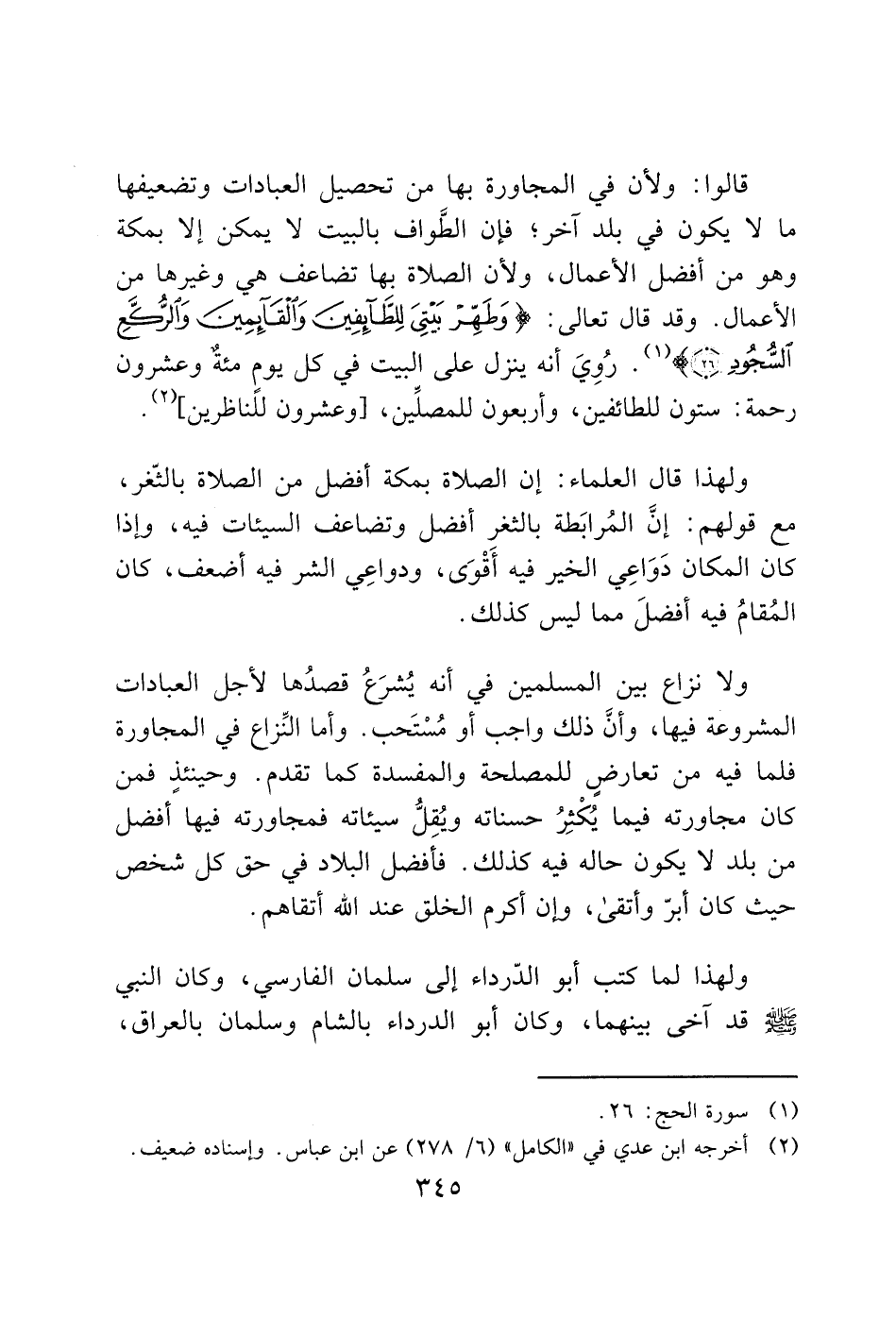 ولهذا قال العلماء: إن الصلاة بمكة أفضل من الصلاة بالثّغر، مع قولهم: إنَّ المُرابَطة بالثغر أفضل وتضاعف السيئات فيه، وإذا كان المكان دَوَاعِي الخير فيه أَقْوَى، ودواعِي الشر فيه أضعف، كان المُقام فيه أفضلَ مما ليس كذلك.