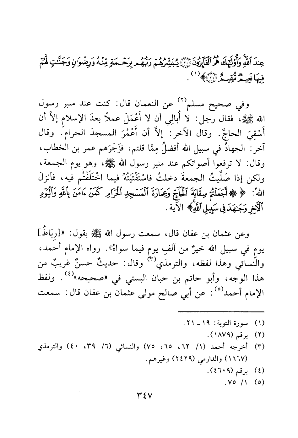 وفي صحيح مسلم (2) عن النعمان قال: كنت عند منبر رسول الله - صَلَّى اللَّهُ عَلَيْهِ وَسَلَّمَ -، فقال رجل: لا أُبالِي أن لا أَعْمَلَ عملاً بعدَ الإسلامِ إلا أن أَسْقِيَ الحاجَّ. وقال الآخر: إلا أن أَعْمُرَ المسجدَ الحرام. وقال آخر: الجهادُ في سبيل الله أفضلُ مِمَّا قلتم، فزَجَرَهم عمر بن الخطاب، وقال: لا ترفعوا أصواتكم عند منبر رسول الله - صَلَّى اللَّهُ عَلَيْهِ وَسَلَّمَ -، وهو يوم الجمعة، ولكن إذا صَلَّيتُ الجمعةَ دخلتُ فاسْتَفْتَيْتُهُ فيما اخْتَلَفْتُم فيه، فأنزلَ اللهُ: (أَجَعَلْتُمْ سِقَايَةَ الْحَاجِّ وَعِمَارَةَ الْمَسْجِدِ الْحَرَامِ كَمَنْ آَمَنَ بِاللَّهِ وَالْيَوْمِ الْآَخِرِ وَجَاهَدَ فِي سَبِيلِ اللَّهِ) هو الآية.