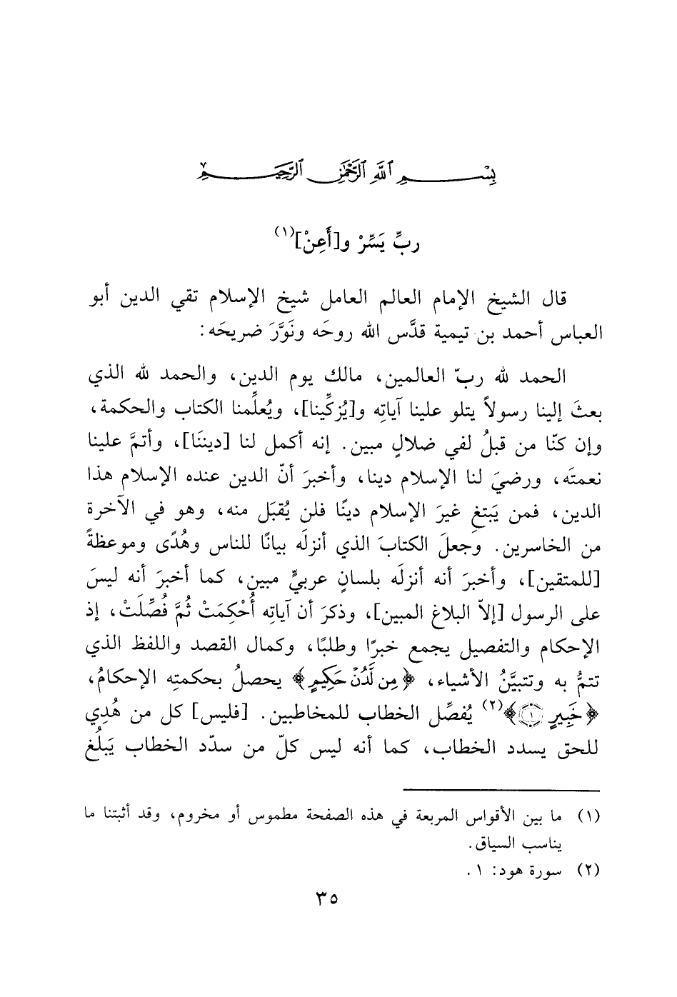 الحمد لله ربّ العالمين، مالك يوم الدين، والحمد لله الذي بعثَ إلينا رسولاً يتلو علينا آياتِه و [يُزكِّينا]، ويُعلمنا الكتاب والحكمة، وإن كنّا من قبلُ لفي ضلالٍ مبين. إنه أكمل لنا [ديننَا]، وأتمَّ علينا نعمتَه، ورضيَ لنا الإسلام دينا، وأخبرَ أنّ الدين عنده الإسلام هذا الدين، فمن يَبتغِ غيرَ الإسلام دينًا فلن يُقبَل منه، وهو في الآخرة من الخاسرين. وجعلَ الكتابَ الذي أنزلَه بيانًا للناس وهُدًى وموعظةً [للمتقين]، وأخبرَ أنه أنزلَه بلسانٍ عربيٍّ مبين، كما أخبرَ أنه ليسَ على الرسول [إلاّ البلاغ المبين]، وذكرَ أن آياتِه أُحْكِمَتْ ثُمَّ فُصلَتْ، إذ الإحكام والتفصيل يجمع خبرًا وطلبًا، وكمال القصد واللفظ الذي تتمُّ به وتتبيَّنُ الأشياء، (مِن لَّدُن حَكِيمٍ) يحصلُ بحكمتِه الإحكامُ، (خَبِيرٍ (1)) (2) يُفصِّل الخطاب للمخاطبين. [فليس] كل من هُدِي للحق يسدد الخطاب، كما أنه ليس كلّ من سدّد الخطاب يَبلُغ