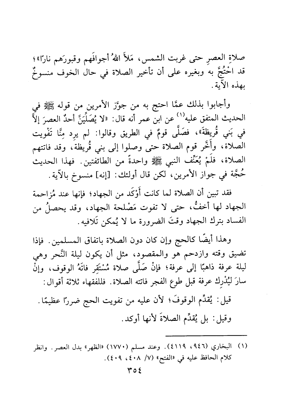 صلاةِ العصرِ حتى غربت الشمس، مَلأَ الله أجوافَهم وقبورَهم نارًا"؛ قد احْتُجَّ به وبغيره على أن تأخير الصلاة في حال الخوف منسوخ بهذه الآية.