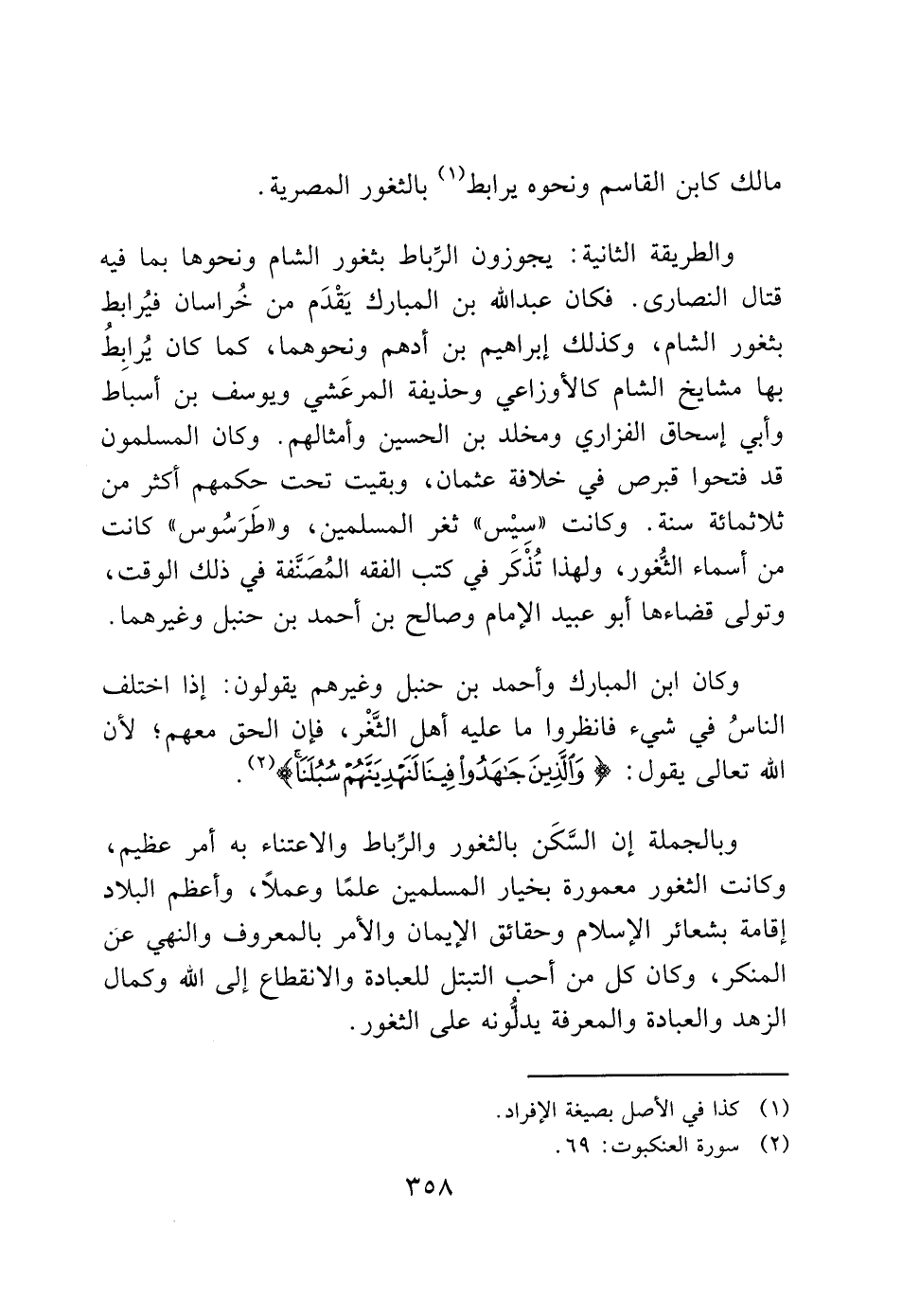 وكان ابن المبارك وأحمد بن حنبل وغيرهم يقولون: إذا اختلف الناسُ في شيء فانظروا ما عليه أهل الثَّغْر، فإن الحق معهم؛ لأن الله تعالى يقول: (وَالَّذِينَ جَاهَدُوا فِينَا لَنَهْدِيَنَّهُمْ سُبُلَنَا) (2).