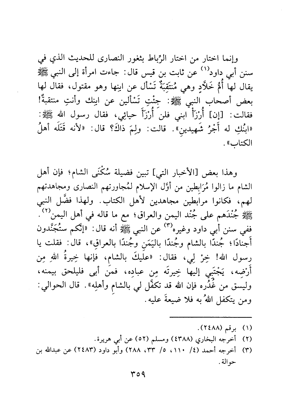 وإنما اختار من اختار الرباط بثغور النصارى للحديث الذي في سنن أبي داود (1) عن ثابت بن قيس قال: جاءت امرأة إلى النبي - صَلَّى اللَّهُ عَلَيْهِ وَسَلَّمَ - يقال لها أُمُّ خَلاَّد وهي منتَقِبَةٌ تَسْأل عن ابنها وهو مقتول، فقال لها بعض أصحاب النبي - صَلَّى اللَّهُ عَلَيْهِ وَسَلَّمَ -: جئْتِ تَسْألين عن ابنك وأنتِ منتقبةٌ!