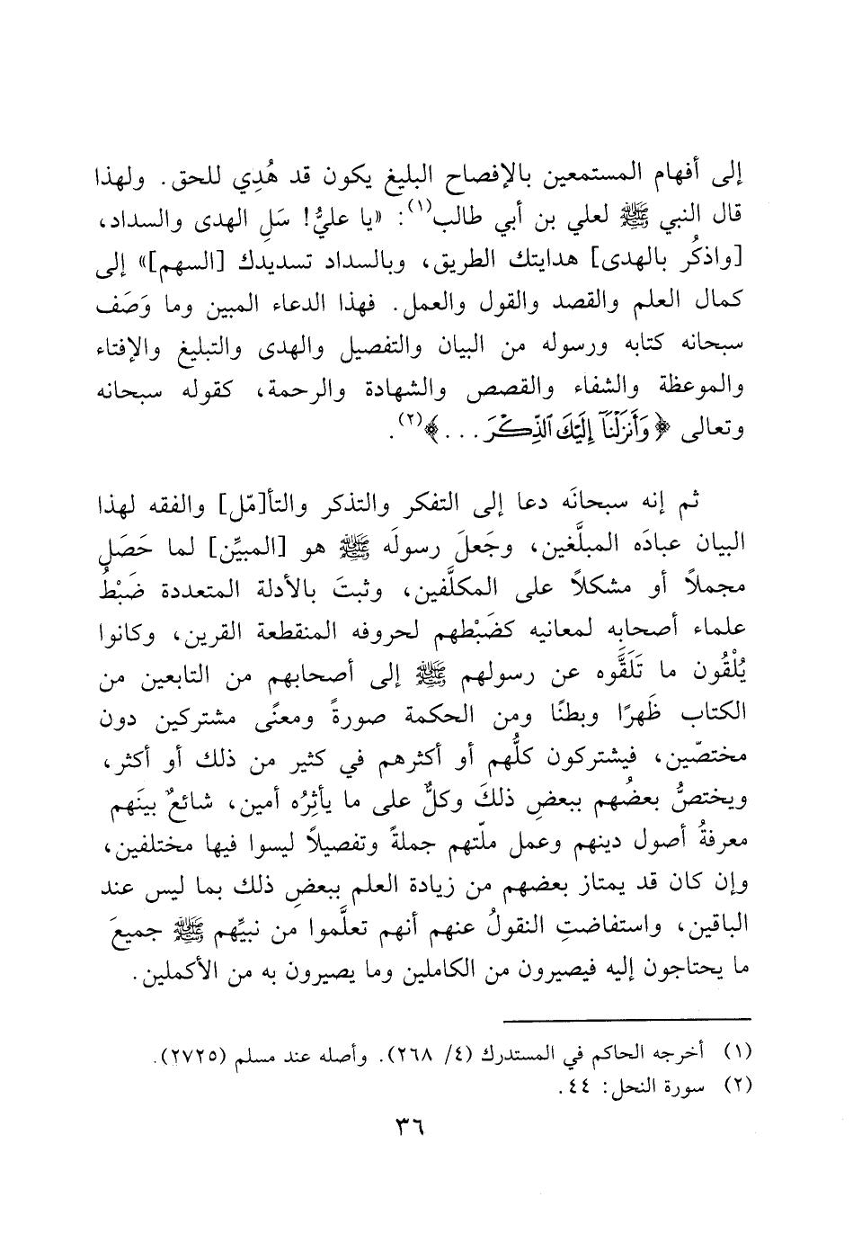 ثم إنه سبحانَه دعا إلى التفكر والتذكر والتأ [مّل] والفقه لهذا البيان عبادَه المبلَّغين، وجَعلَ رسولَه - صَلَّى اللَّهُ عَلَيْهِ وَسَلَّمَ - هو [المبيِّن] لما حَصَل مجملاً أو مشكلاً على المكلَّفين، وثبتَ بالأدلة المتعددة ضَبْطُ علماء أصحابه لمعانيه كضَبْطهم لحروفه المنقطعة القرين، وكانوا يُلْقُون ما تَلَقًّوه عن رسولهم - صَلَّى اللَّهُ عَلَيْهِ وَسَلَّمَ - إلى أصحابهم من التابعين من الكتاب ظَهرًا وبطنًا ومن الحكمة صورةً ومعنًى مشتركين دون مختصّين، فيشتركون كلُّهم أو أكثرهم في كثير من ذلك أو أكثر، ويختصُّ بعضهم ببعضِ ذلكَ وكلٌّ على ما يأثِرُه أمين، شائع بينَهم معرفةُ أصول دينهم وعمل ملّتهم جملةً وتفصيلاً ليسوا فيها مختلفين، وإن كان قد يمتاز بعضهم من زيادة العلم ببعضِ ذلك بما ليس عند الباقين، واستفاضتِ النقول عنهم أنهم تعلَّموا من نبيِّهم - صَلَّى اللَّهُ عَلَيْهِ وَسَلَّمَ - جميعَ ما يحتاجون إليه فيصيرون من الكاملين وما يصيرون به من الأكملين.
