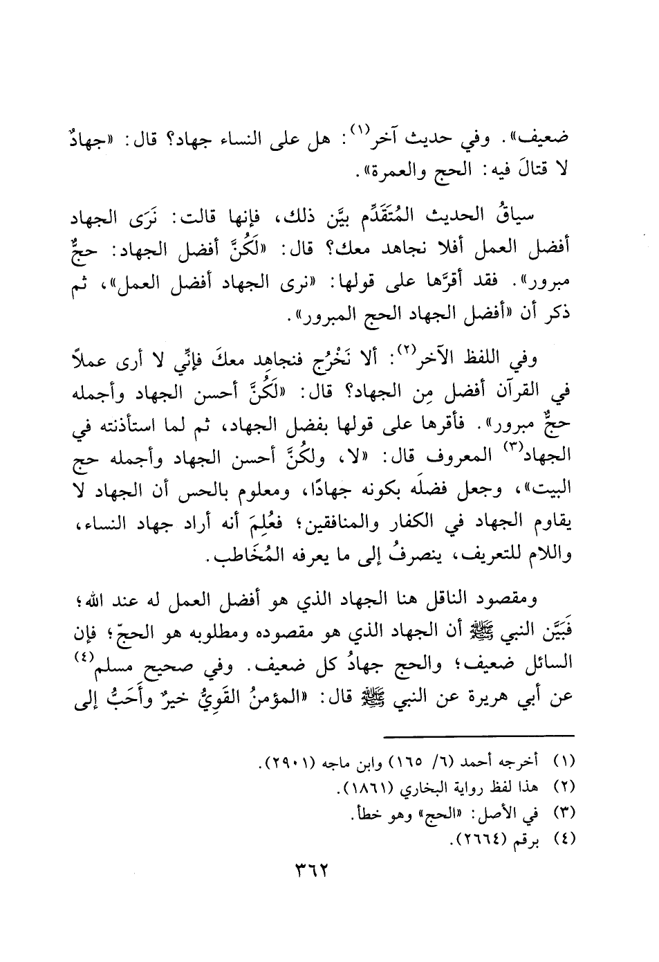 ومقصود الناقل هنا الجهاد الذي هو أفضل العمل له عند الله؛ فَبَيَّن النبي - صَلَّى اللَّهُ عَلَيْهِ وَسَلَّمَ - أن الجهاد الذي هو مقصوده ومطلوبه هو الحجّ؛ فإن السائل ضعيف؛ والحج جهادُ كل ضعيف. وفي صحيح مسلم (4) عن أبي هريرة عن النبي - صَلَّى اللَّهُ عَلَيْهِ وَسَلَّمَ - قال: "المؤمنُ القَوِيُّ خير وأَحَبُّ إلى
