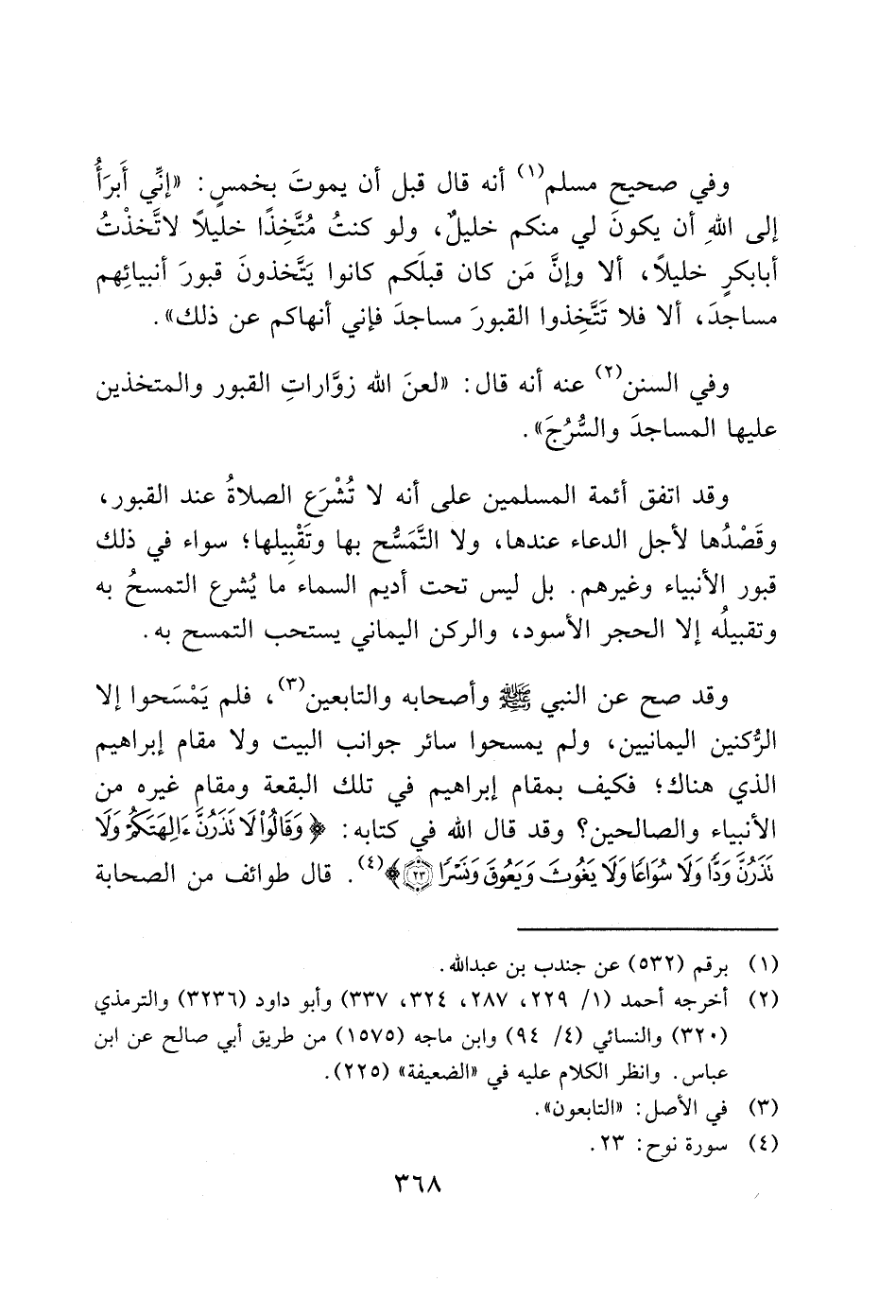 وقد صح عن النبي - صَلَّى اللَّهُ عَلَيْهِ وَسَلَّمَ - وأصحابه والتابعين (3)، فلم يَمْسَحوا إلا الرُّكنين اليمانيين، ولم يمسحوا سائر جوانب البيت ولا مقام إبراهيم الذي هناك؛ فكيف بمقام إبراهيم في تلك البقعة ومقامِ غيره من الأنبياء والصالحين؟ وقد قال الله في كتابه: (وَقَالُوا لَا تَذَرُنَّ آَلِهَتَكُمْ وَلَا تَذَرُنَّ وَدًّا وَلَا سُوَاعًا وَلَا يَغُوثَ وَيَعُوقَ وَنَسْرًا (23)) (4). قال طوائف من الصحابة