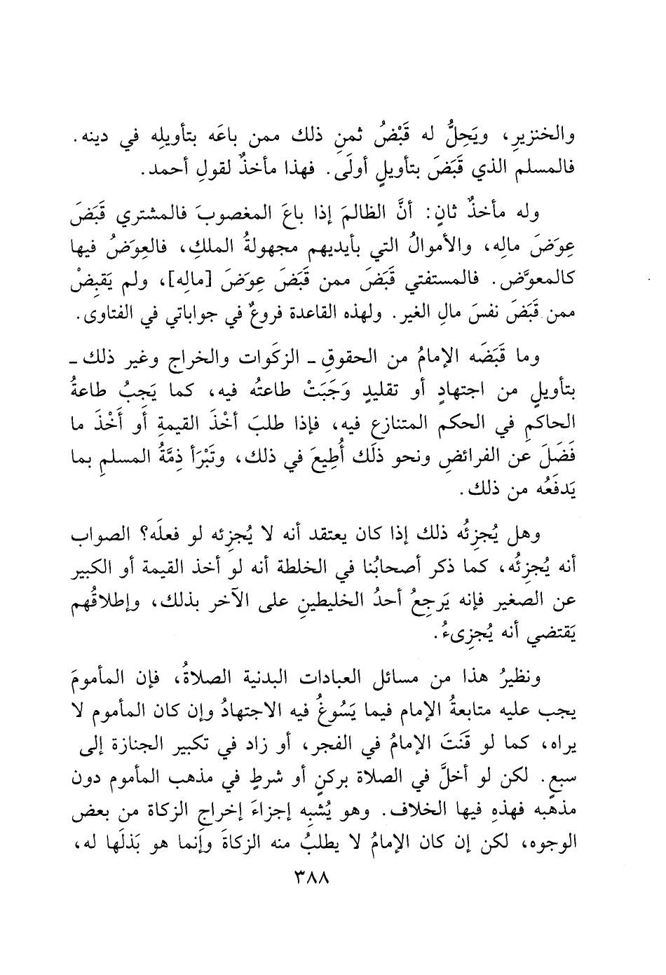 وما قَبَضَه الإمامُ من الحقوقِ -الزكَوات والخراج وغير ذلك- بتأويلِ من اجتهادٍ أو تقليل وَجَبَتْ طاعتُه فيه، كما يَجبُ طاعةُ الحاكمِ في الحكم المتنازع فيه، فإذا طلبَ أخْذَ القيمةِ أَو أَخْذَ ما فَضَلَ عن الفرائضِ ونحو ذلَك أُطِيعَ في ذلك، وتَبْرَأ ذِمَّةُ المسلمِ بما يَدفعُه من ذلك.