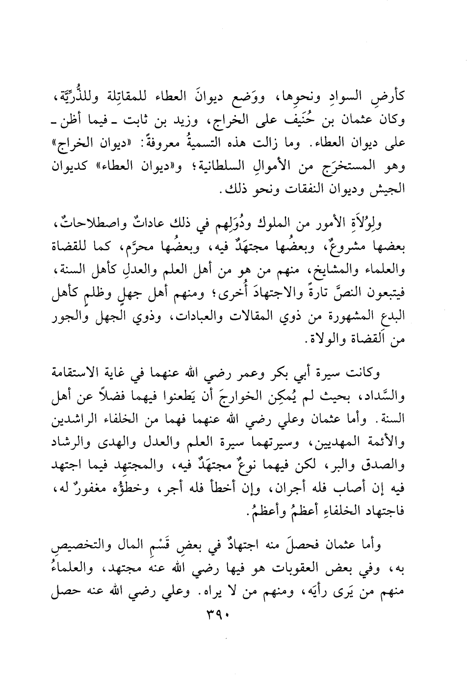 وأما عثمان فحصلَ منه اجتهاد في بعضِ قَسْمِ المال والتخصيصِ به، وفي بعض العقوبات هو فيها رضي الله عنه مجتهد، والعلماءُ منهم من يَرى رأيَه، ومنهم من لا يراه. وعلي رضي الله عنه حصل