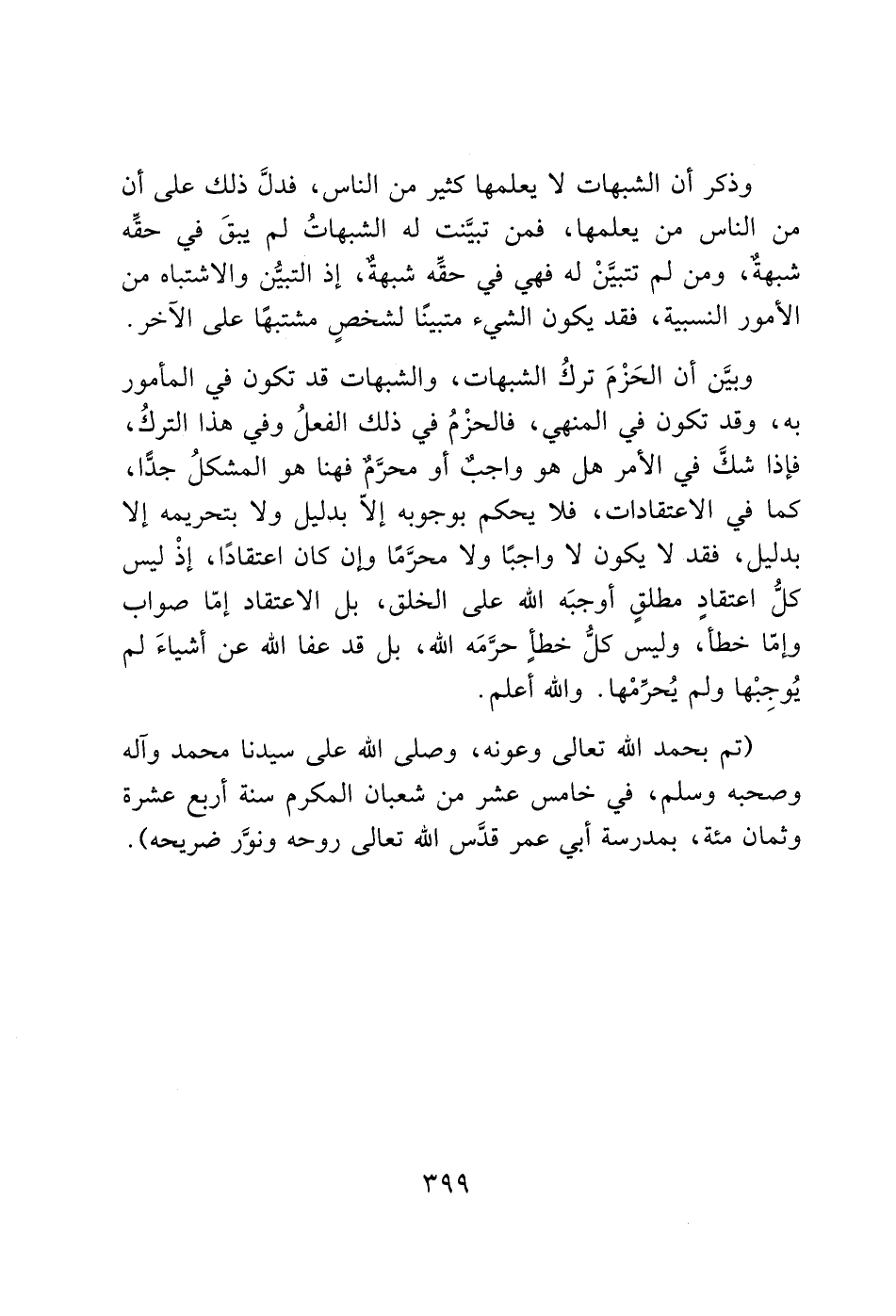 وبيَّن أن الحَزْمَ تركُ الشبهات، والشبهات قد تكون في المأمور به، وقد تكون في المنهي، فالحزْمُ في ذلك الفعلُ وفي هذا التركُ، فإذا شكَّ في الأمر هل هو واجبٌ أو محرَّمٌ فهنا هو المشكلُ جدًّا، كما في الاعتقادات، فلا يحكم بوجوبه إلاّ بدليل ولا بتحريمه إلا بدليل، فقد لا يكون لا واجبًا ولا محرَّمًا وإن كان اعتقادًا، إذْ ليس كلُّ اعتقادٍ مطلقٍ أوجبَه الله على الخلق، بل الاعتقاد إمّا صواب وإمّا خطأ، وليس كلُّ خطأٍ حرَّمَه الله، بل قد عفا الله عن أشياءَ لم يُوجِبْها ولم يُحرِّمْها. والله أعلم.