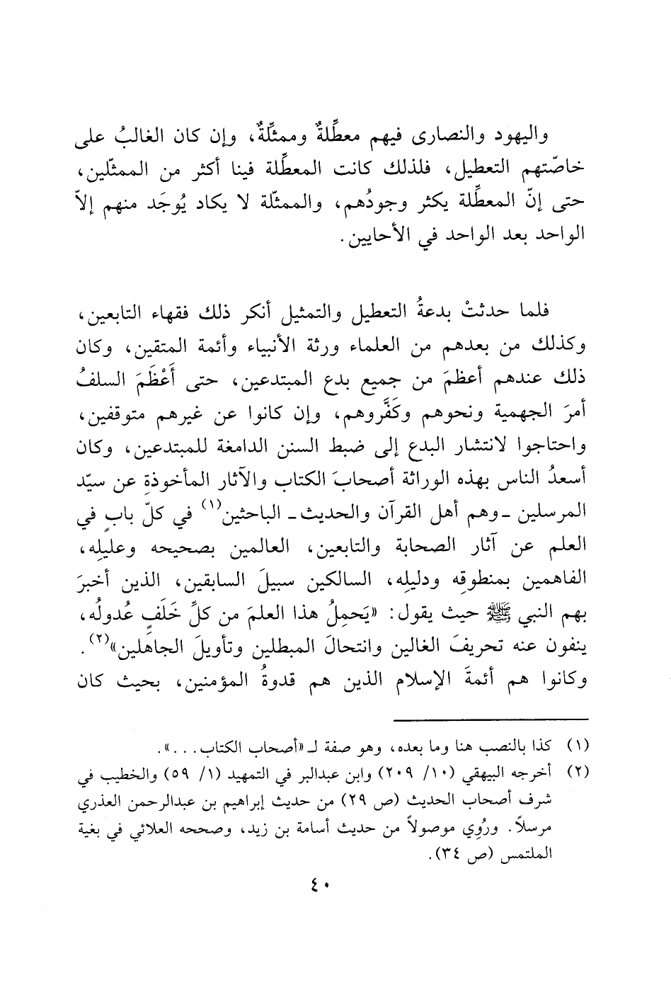 فلما حدثتْ بدعةُ التعطيل والتمثيل أنكر ذلك فقهاء التابعين، وكذلك من بعدهم من العلماء ورثة الأنبياء وأئمة المتقين، وكان ذلك عندهم أعظمَ من جميع بدع المبتدعين، حتى أَعْظَمَ السلفُ أمرَ الجهمية ونحوهم وكَفَّروهم، وإن كانوا عن غيرهم متوقفين، واحتاجوا لانتشار البدع إلى ضبط السنن الدامغة للمبتدعين، وكان أسعدُ الناس بهذه الوراثة أصحابَ الكتاب والآثار المأخوذةِ عن سيّد المرسلين -وهم أهل القرآن والحديث- الباحثين (1) في كلّ باب في العلم عن آثار الصحابة والتابعين، العالمين بصحيحه وعليلِه، الفاهمين بمنطوقِه ودليلِه، السالكين سبيلَ السابقين، الذين أخبرَ بهم النبي - صَلَّى اللَّهُ عَلَيْهِ وَسَلَّمَ - حيث يقول: "يَحمِلُ هذا العلمَ من كلِّ خَلَفٍ عُدولُه، ينفون عنه تحريفَ الغالين وانتحالَ المبطلين وتأويلَ الجاهَلين" (2).