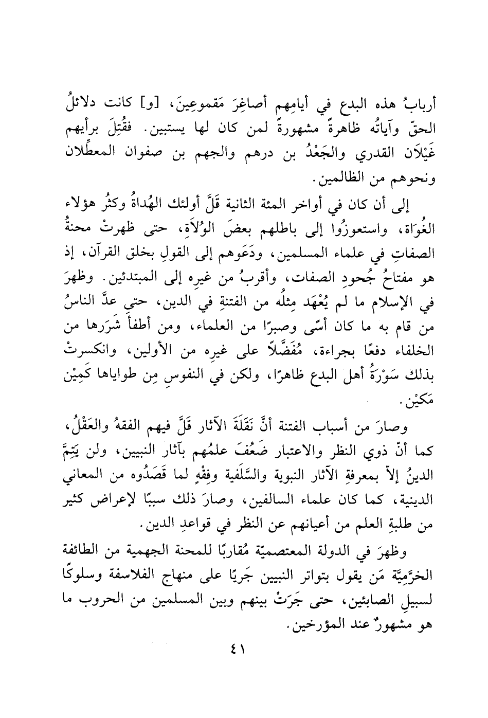 إلى أن كان في أواخر المئة الثانية قَلَّ أولئك الهُداةُ وكثُر هؤلاء الغُوَاة، واستعوزُوا إلى باطلهم بعضَ الوُلاَةِ، حتى ظهرتْ محنةُ الصفاتِ في علماء المسلمين، ودَعَوهم إلى القولِ بخلق القرآن، إذ هو مفتاحُ جُحودِ الصفات، وأقربُ من غيرِه إلى المبتدئين. وظهرَ في الإسلام ما لم يُعْهَد مِثلُه من الفتنةِ في الدين، حتى عدَّ الناسُ من قام به ما كان أسى وصبرًا من العلماء، ومن أطفأَ شَرَرها من الخلفاء دفعًا بجراءة، مُفَضلاً على غيرِه من الأولين، وانكسرتْ بذلك سَوْرَةُ أهل البدع ظاهرًا، ولكن في النفوسِ مِن طواياها كَمِيْن مَكيْن.