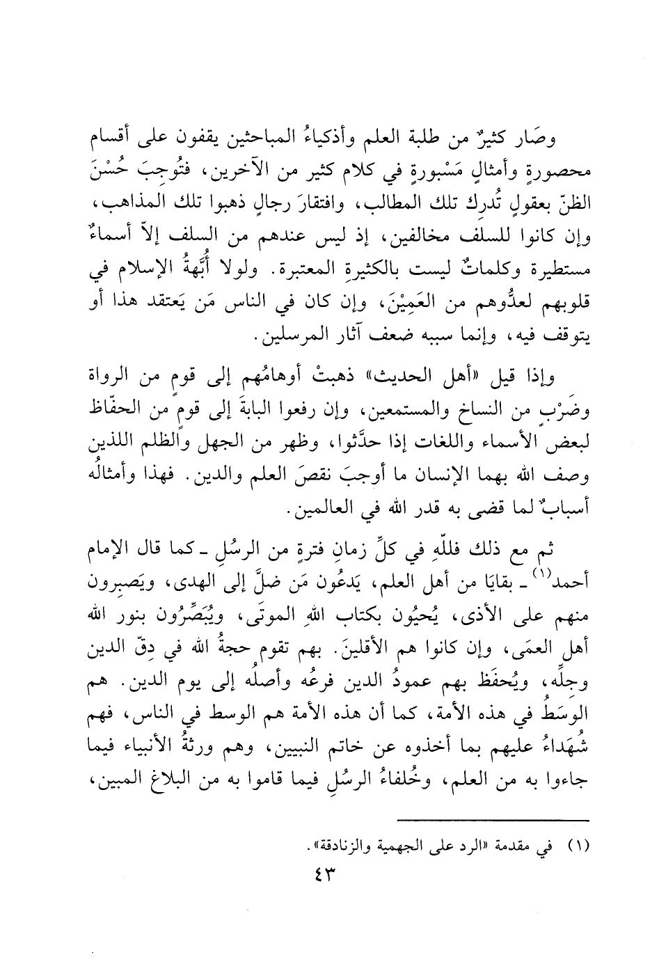 وصَار كثير من طلبة العلم وأذكياءُ المباحثين يقفون على أقسام محصورةٍ وأمثال مَسْبورةٍ في كلام كثير من الآخرين، فتُوجبَ حُسْنَ الظنّ بعقولٍ تُدرِك تلك المطالب، وافتقارَ رجالٍ ذهبوا تلك المذاهب، وإن كانوا للسلف مخالفين، إذ ليس عندهم من السلف إلاّ أسماءٌ مستطيرة وكلمات ليست بالكثيرةِ المعتبرة. ولولا أُبَّهةُ الإسلام في قلوبهم لعدُّوهم من العَمِيْنَ، وإن كان في الناس مَن يَعتقد هذا أو يتوقف فيه، وإنما سببه ضعف آثار المرسلين.