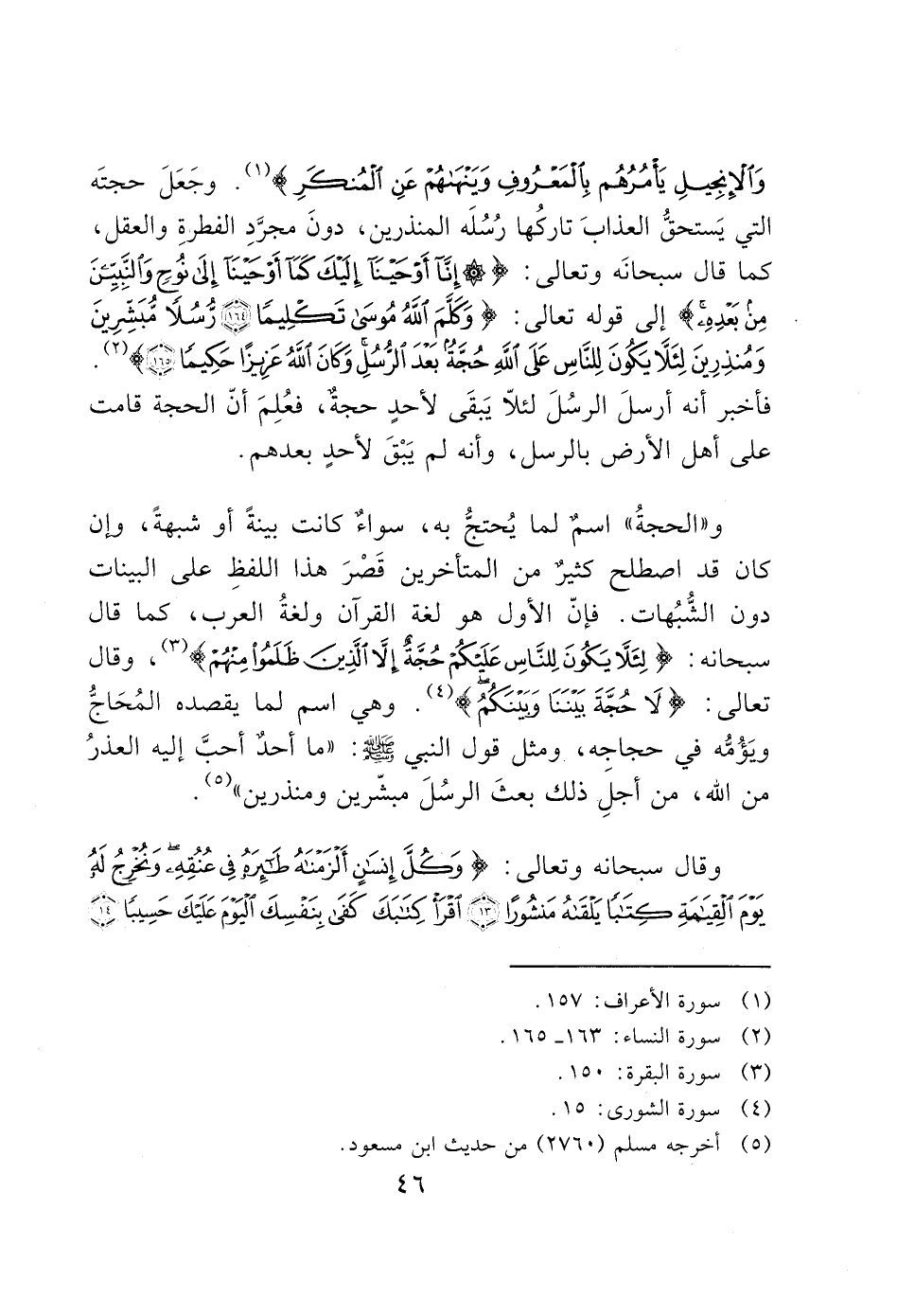 و"الحجةُ" اسم لما يُحتجُّ به، سواءٌ كانت بينةً أو شبهةً، وإن كان قد اصطلح كثير من المتأخرين قَصْرَ هذا اللفظِ على البينات دون الشُّبُهات. فإنّ الأول هو لغة القرآن ولغةُ العرب، كما قال سبحانه: (لِئَلَّا يَكُونَ لِلنَّاسِ عَلَيْكُمْ حُجَّةٌ إِلَّا الَّذِينَ ظَلَمُوا مِنْهُمْ) (3)، وقال تعالى: (لَا حُجَّةَ بَيْنَنَا وَبَيْنَكُمُ) (4). وهي اسم لما يقصده المُحَاجُّ ويَؤُمُّه في حجاجه، ومثل قول النبي - صَلَّى اللَّهُ عَلَيْهِ وَسَلَّمَ -: "ما أحد أحبَّ إليه العذرُ من الله، من أجلِ ذلك بعثَ الرسُلَ مبشّرين ومنذرين" (5).