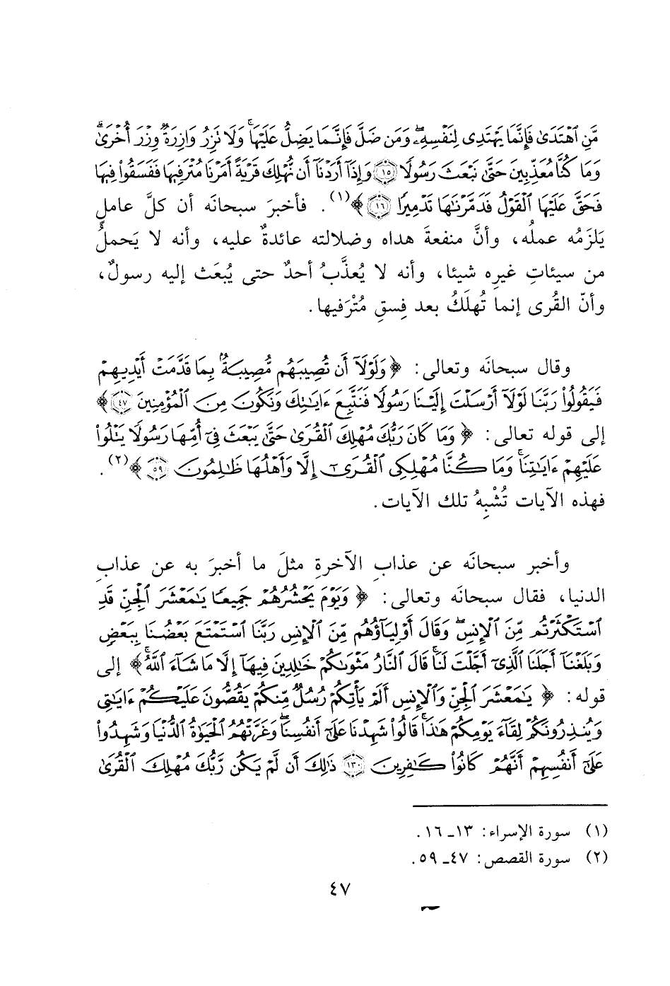 إلى قوله تعالى: (وَمَا كَانَ رَبُّكَ مُهْلِكَ الْقُرَى حَتَّى يَبْعَثَ فِي أُمِّهَا رَسُولًا يَتْلُو عَلَيْهِمْ آَيَاتِنَا وَمَا كُنَّا مُهْلِكِي الْقُرَى إِلَّا وَأَهْلُهَا ظَالِمُونَ (59)) (2).