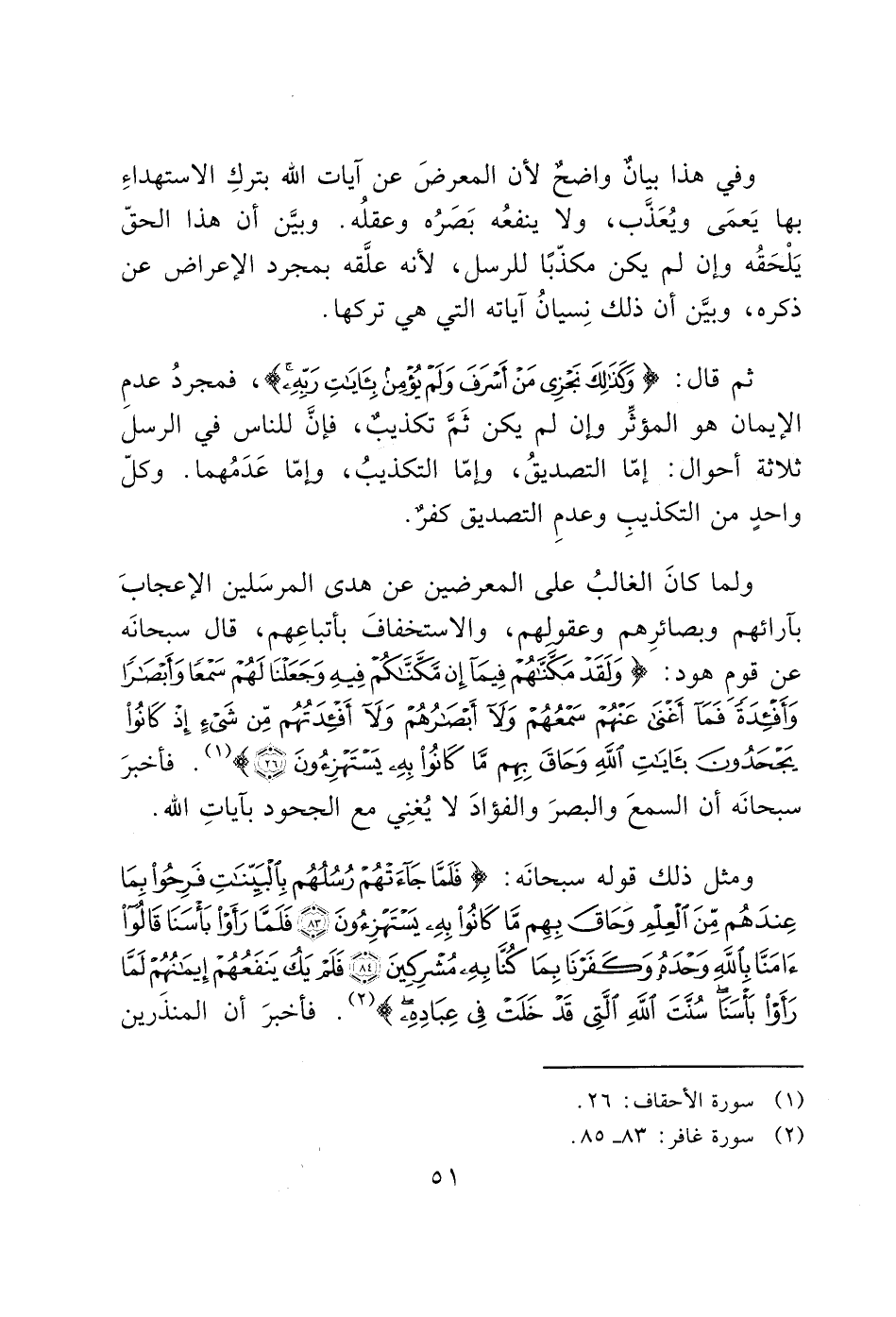 ولما كانَ الغالبُ على المعرضين عن هدى المرسلين الإعجابَ بآرائهم وبصائرِهم وعقولهم، والاستخفافَ بأتباعِهم، قال سبحانَه عن قومِ هود: (وَلَقَدْ مَكَّنَّاهُمْ فِيمَا إِنْ مَكَّنَّاكُمْ فِيهِ وَجَعَلْنَا لَهُمْ سَمْعًا وَأَبْصَارًا وَأَفْئِدَةً فَمَا أَغْنَى عَنْهُمْ سَمْعُهُمْ وَلَا أَبْصَارُهُمْ وَلَا أَفْئِدَتُهُمْ مِنْ شَيْءٍ إِذْ كَانُوا يَجْحَدُونَ بِآَيَاتِ اللَّهِ وَحَاقَ بِهِمْ مَا كَانُوا بِهِ يَسْتَهْزِئُونَ (26)) (1). فأخبرَ سبحانَه أن السمعَ والبصرَ والفؤادَ لا يُغنِي مع الجحود بآياتِ الله.