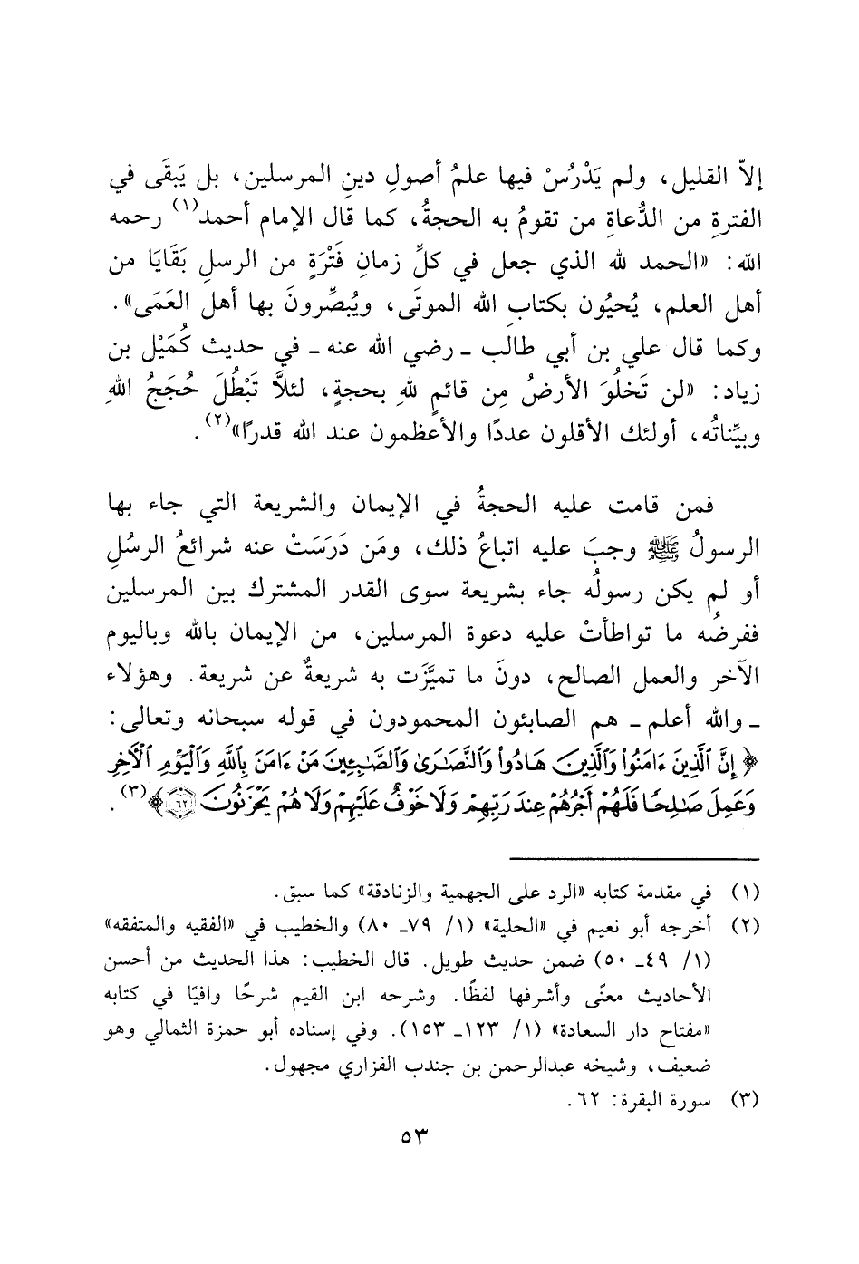 وكما قال علي بن أبي طالَب -رضي الله عنه- في حديث كُمَيْل بن زياد: "لن تَخلُوَ الأرضُ مِن قائمٍ لله بحجةٍ، لئلاَّ تَبْطُلَ حُجَجُ الله وبيِّناتُه، أولئك الأقلون عددًا والأعظمون عند الله قدرًا" (2). فمن قامت عليه الحجةُ في الإيمان والشريعة التي جاء بها الرسولُ - صَلَّى اللَّهُ عَلَيْهِ وَسَلَّمَ - وجبَ عليه اتباعُ ذلك، ومَن دَرَسَتْ عنه شرائعُ الرسُلِ أو لم يكن رسولُه جاء بشريعة سوى القدر المشترك بين المرسلين ففرضُه ما تواطأتْ عليه دعوة المرسلين، من الإيمان بالله وباليوم الآخر والعمل الصالح، دونَ ما تميَّزَت به شريعةٌ عن شريعة. وهؤلاء -والله أعلم- هم الصابئون المحمودون في قوله سبحانه وتعالى: (إِنَّ الَّذِينَ آَمَنُوا وَالَّذِينَ هَادُوا وَالنَّصَارَى وَالصَّابِئِينَ مَنْ آَمَنَ بالله وَالْيَوْمِ الآخر وَعَمِلَ صَالِحًا فَلَهُمْ أَجْرُهُمْ عِنْدَ رَبِّهِمْ وَلَا خَوْفٌ عَلَيْهِمْ وَلَا هُمْ يَحْزَنُونَ (62)) (3).