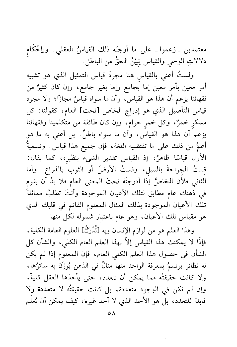 ولستُ أعني بالقياسِ هنا مجردَ قياس التمثيل الذي هو تشبيه أمر معين بأمر معين إما بجامع وإما بغير جامع، وإن كان كثيرٌ من فقهائنا يزعم أن هذا هو القياس، وأن ما سواه قياسٌ مجازًا؛ ولا مجرد قياس التأصيل الذي هو إدراج الخاص [تحت] العام، كقولنا: كل مسكرٍ خمرٌ، وكل خمرٍ حرام، وإن كان طائفة من متكلمينا وفقهائنا يزعم أن هذا هو القياس، وأن ما سواه باطل. بل أعني به ما هو أعمُّ من ذلك على ما تقتضيه اللغة، فإن جميع هذا قياس. وتسميةُ الأول قياسًا ظاهر، إذ القياس تقدير الشيء بنظيرِه، كما يقال: قِستُ الجراحةَ بالميلِ، وقستُ الأرضَ أو الثوب بالذراع. وأما الثاني فلأن الخاصَّ إذا أدرجتَه تحتَ المعنى العام فلا بدَّ أن يقوم في ذهنك عام مطابق لتلك الأعيان الموجودة وأنتَ تطلبُ مماثلةَ تلك الأعيان الموجودة بذلك المثال المعلوم القائم في قلبك الذي هو مقياس تلك الأعيان، وهو عام باعتبار شموله لكل منها.
