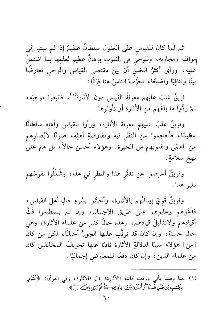 وفريق قَوِيَ إيمانُهم بالأثارة، وأحسُّوا بسُوءِ حالِ أهل القياس، فذَمُّوهم وعابوهم على طريق الإجمال، وإن لم يستطيعوا فَكَّ أقيادِهم ولاتذليلَ قيادهم، وهذه حالُ كثير من علماء الأثارة، وهي حال حسنة، وإن كان قد ترتَّب عليها الجورُ أحيانًا، لكن من كان [من] هؤلاء سببًا لدلالةِ الأثارة نافيًا عنها تحريفَ المخالفين كان من علماء الدين، وإن كان دفعُه للمعارضِ إجماليا.
