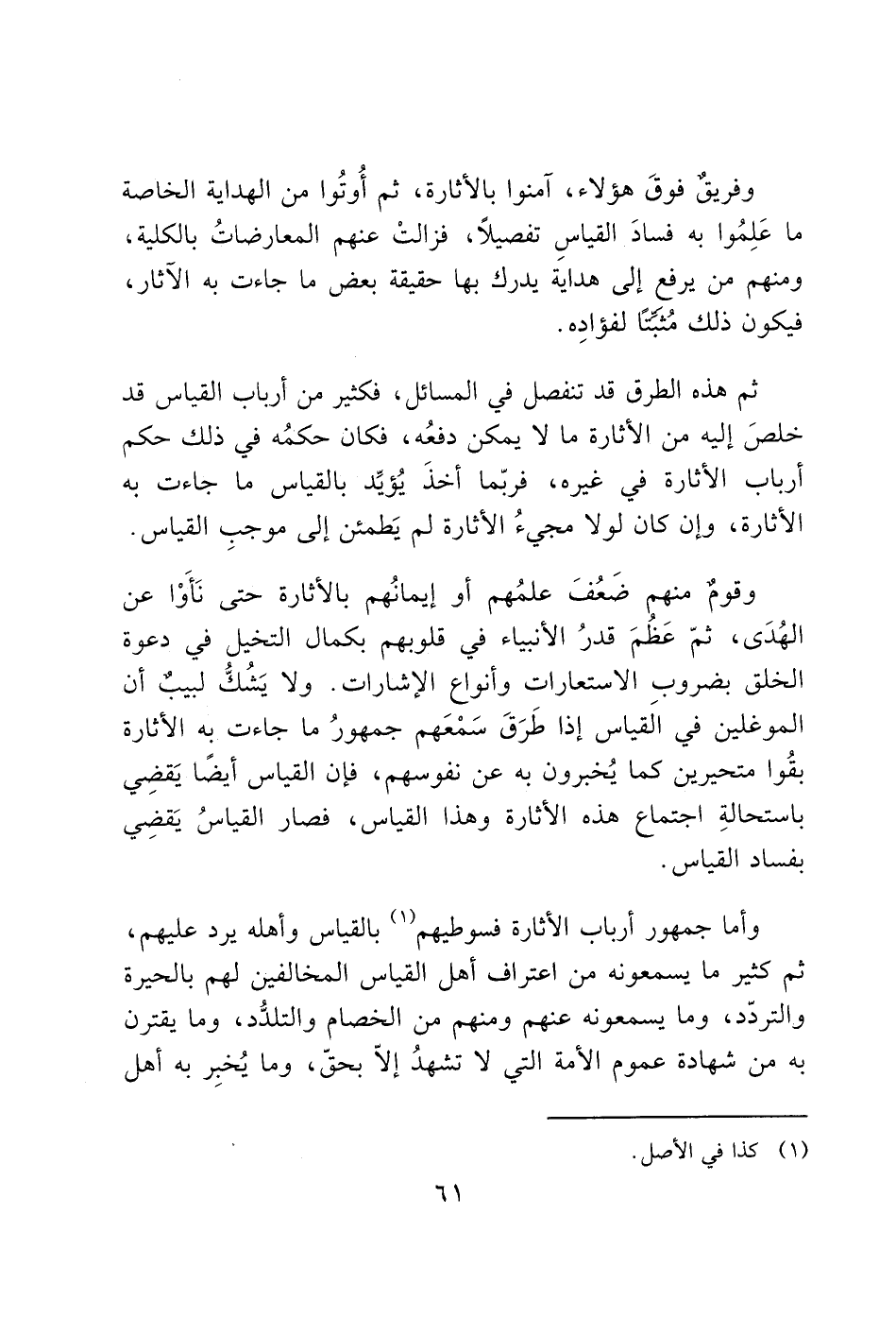 وأما جمهور أرباب الأثارة فسوطيهم (1) بالقياس وأهله يرد عليهم، ثم كثير ما يسمعونه من اعتراف أهل القياس المخالفين لهم بالحيرة والتردد، وما يسمعونه عنهم ومنهم من الخصام والتلدُّد، وما يقترن به من شهادة عموم الأمة التي لا تشهدُ إلاّ بحقّ، وما يُخبِر به أهل