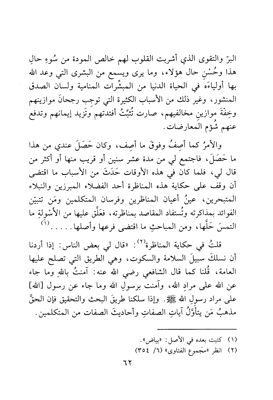قلتُ في حكاية المناظرة (2): "قال لي بعض الناس: إذا أردنا أن نسلكَ سبيلَ السلامة والسكوت، وهي الطريق التي تصلح عليها العامة، قُلنا كما قال الشافعي رضي الله عنه: آمنتُ بالله وما جاء عن الله على مرادِ الله، وآمنت برسولِ الله وما جاء عن رسول [الله] على مراد رسولِ الله - صَلَّى اللَّهُ عَلَيْهِ وَسَلَّمَ -. وإذا سلكنا طريقَ البحث والتحقيق فإن الحقَّ مذهبُ مَن يتأَوَّلُ آياتِ الصفاتِ وأحاديثَ الصفات من المتكلمين.