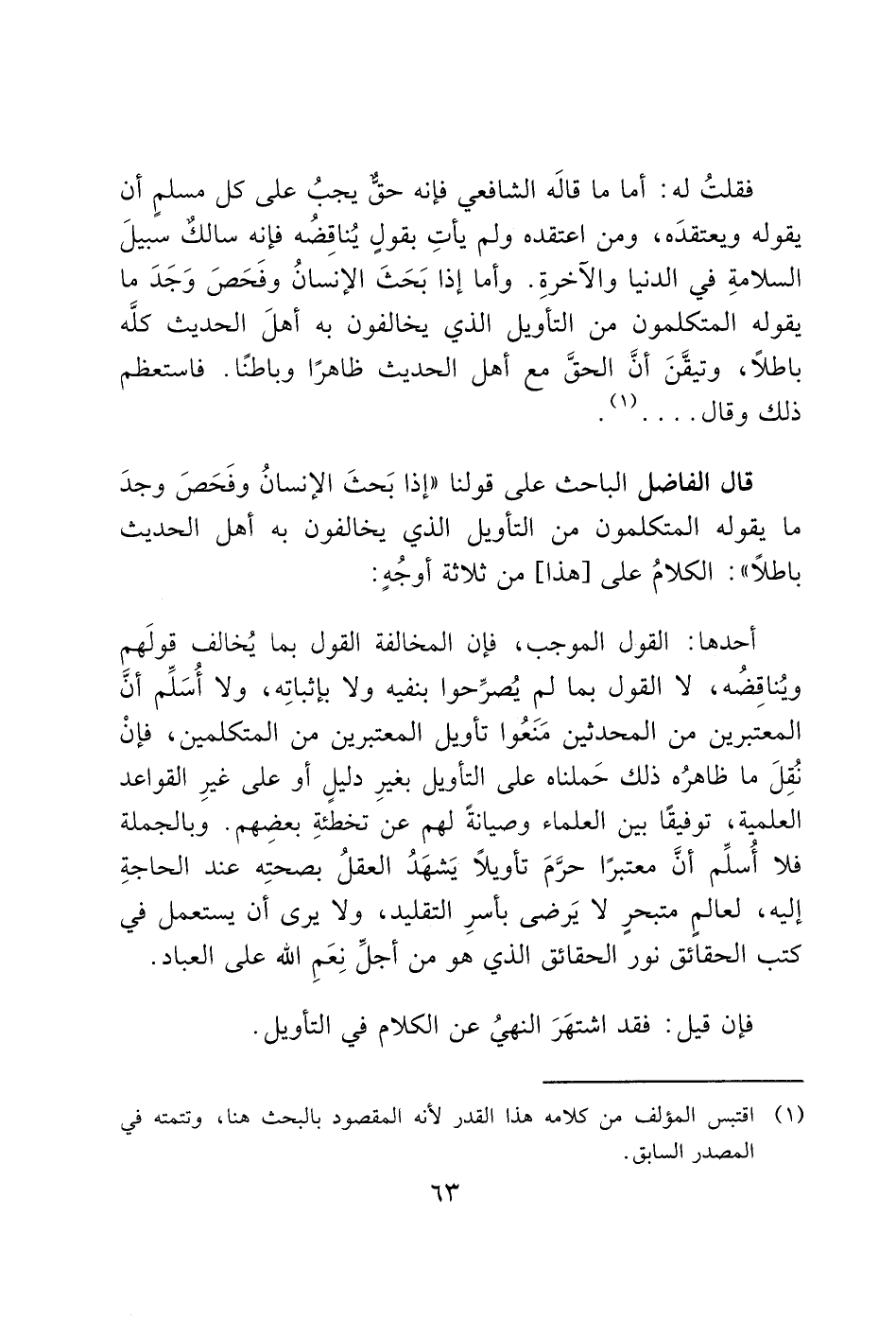 ما يقوله المتكلمون من التأويل الذي يخالفون به أهل الحديث باطلاً": الكلامُ على [هذا] من ثلاثة أوجُهٍ: