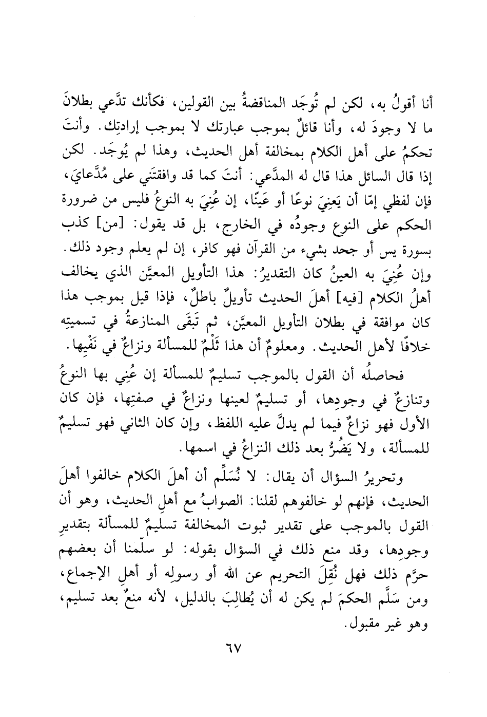 أنا أقولُ به، لكن لم تُوجَد المناقضةُ بين القولين، فكأنك تدَّعي بطلانَ ما لا وجودَ له، وأنا قائلٌ بموجب عبارتك لا بموجب إرادتِك. وأنتَ تحكمُ على أهل الكلام بمخالفة أهل الحديث، وهذا لم يُوجَد. لكن إذا قال السائل هذا قال له المدَّعي: أنتَ كما قد وافقتَني على مُدَّعايَ، فإن لفظي إمّا أن يَعنِيَ نوعًا أو عَينًا، إن عُنِيَ به النوعُ فليس من ضرورة الحكم على النوع وجودُه في الخارج، بل قد يقول: [من] كذب بسورة يس أو جحد بشيء من القرآن فهو كافر، إن لم يعلم وجود ذلك.
