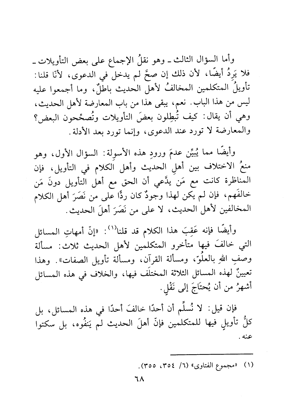 وأما السؤال الثالث -وهو نقلُ الإجماع على بعض التأويلات- فلا يَرِدُ أيضًا، لأن ذلك إن صحَّ لم يدخل في الدعوى، لأنّا قلنا: تأويلُ المتكلمين المخالفُ لأهل الحديث باطل، وما أجمعوا عليه ليس من هذا الباب. نعم، يبقى هذا من باب المعارضة لأهل الحديث، وهي أن يقال: كيف تُبطِلون بعضَ التأويلات وتُصحِّحون البعض؟